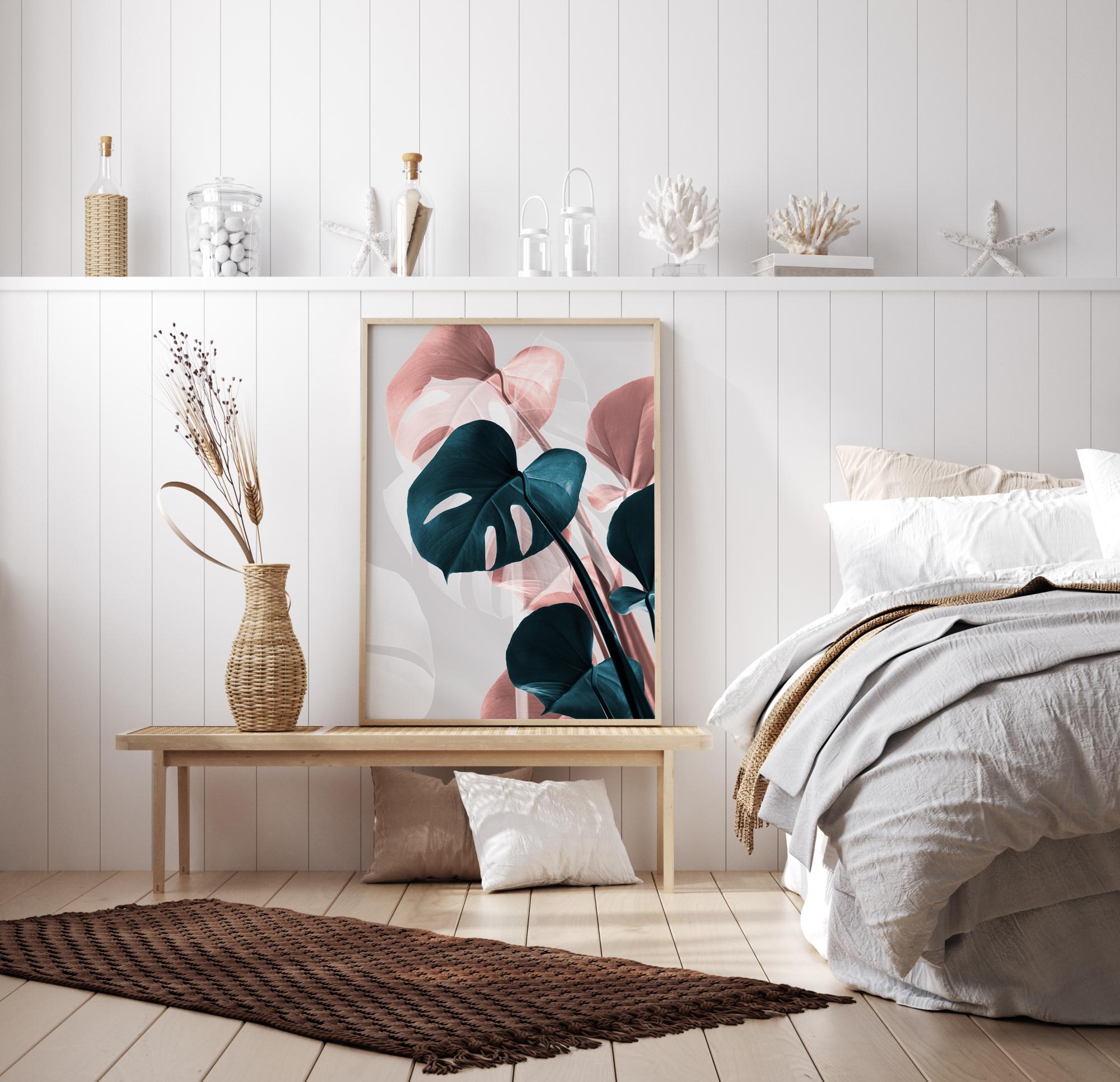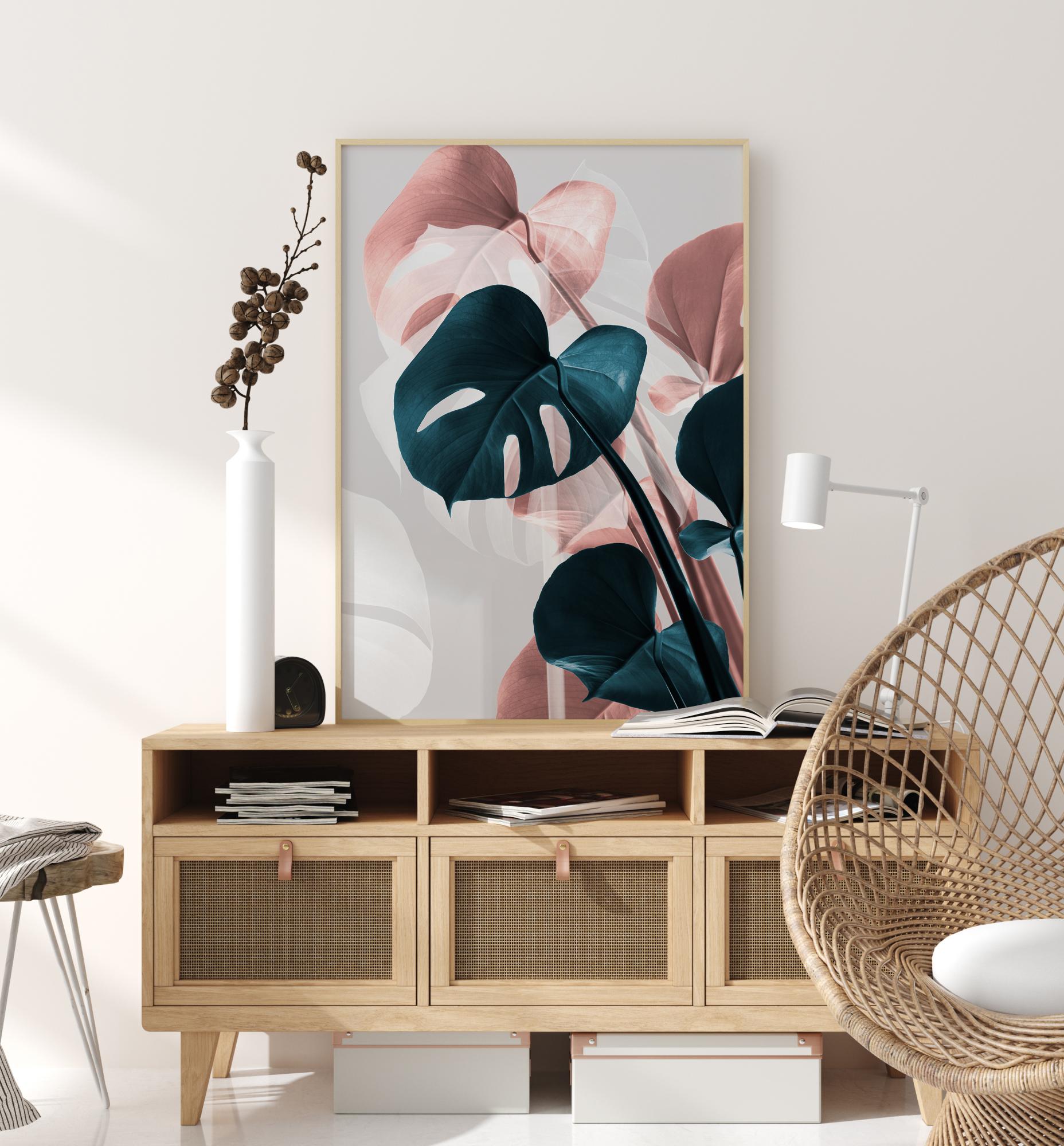 Un hermoso póster con hojas de monstera en rosa y verde oscuro que muestra la perfecta creatividad en las hojas. Con un fondo de color beige, las hojas en forma de corazón brillan con sus hermosas hojas verdes y rosas. Los patrones en forma de hoja le dan una sensación emocionante a tu hogar.