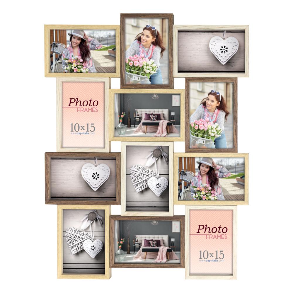 El marco tiene espacio para 12 fotos, todas de tamaño 10x15 cm, lo que facilita la creación de una pared de fotos personal y variada. Con sus dimensiones de 59x44,5 cm, se convierte en un detalle llamativo en la pared.
