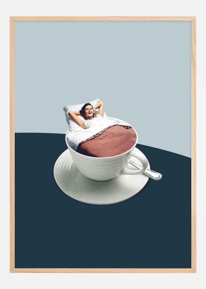 Este original y imaginativo póster retrata a una mujer que parece estar disfrutando de un momento relajante en un entorno inusual: ella se encuentra cómodamente en una taza blanca llena de café, rodeada de un espacio azul tranquilizador que sugiere el amanecer de un nuevo día. El tamaño de la taza en relación con la mujer crea una sensación surrealista, y su postura relajada en ropa de cama añade un toque de comodidad cotidiana y humor a la escena.