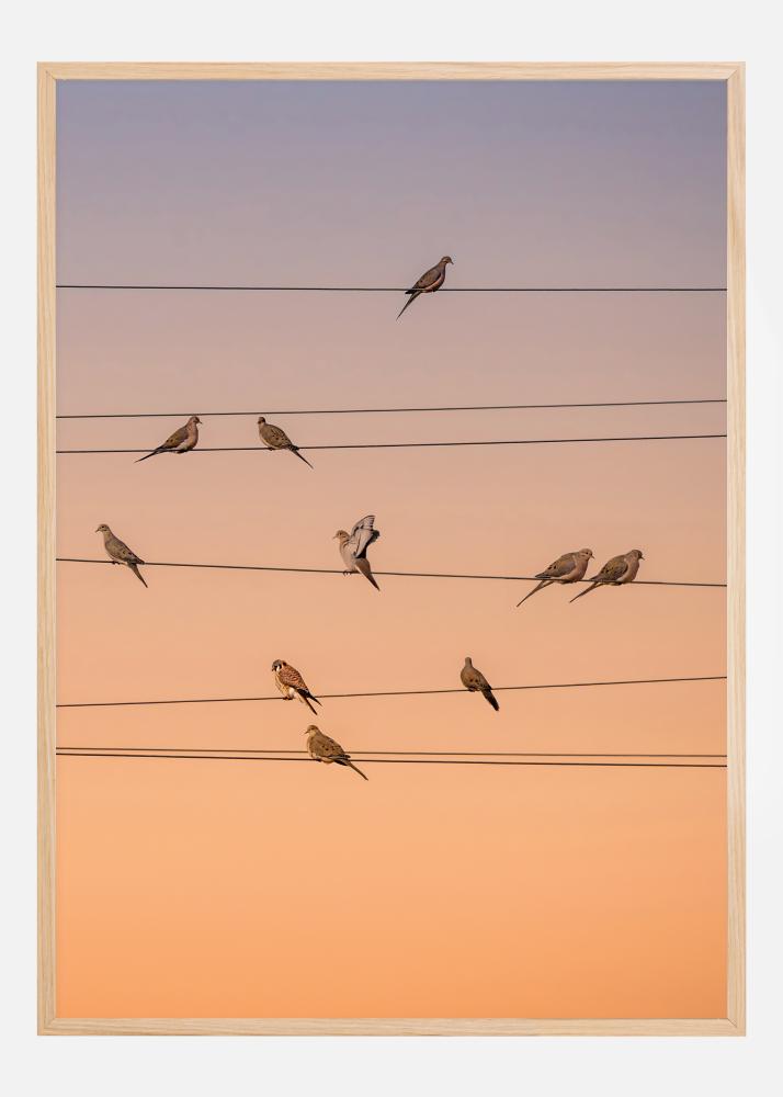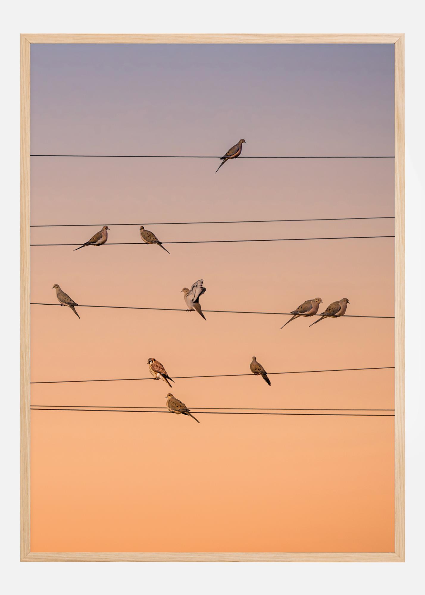 Un fantástico póster con pájaros posados en cables eléctricos en una puesta de sol naranja. Los pájaros y los cables recuerdan a una partitura que evoca el canto de los pájaros. Esta imagen queda bien en todas las paredes de la sala de estar.