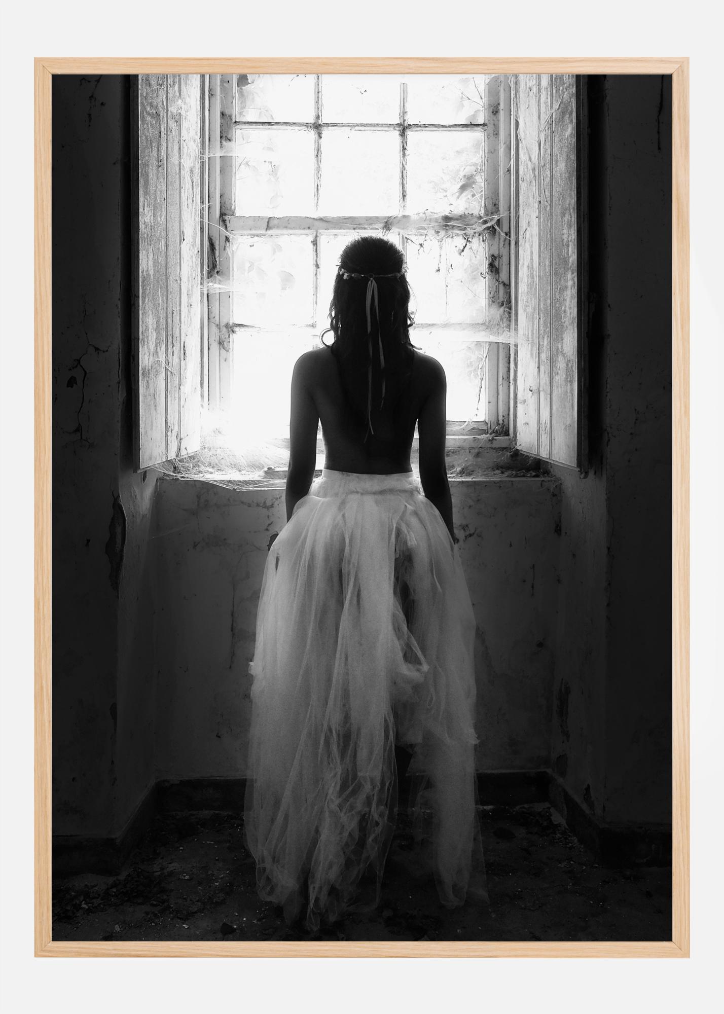 Una hermosa foto en blanco y negro de una mujer semidesnuda parada junto a una vieja ventana. La ventana sucia está cubierta de telarañas y la mujer mira hacia afuera a través de la ventana. Vestida con una falda de tul blanca, la joven mujer parece estar sumida en sus pensamientos. Un póster perfecto para colgar en un dormitorio.