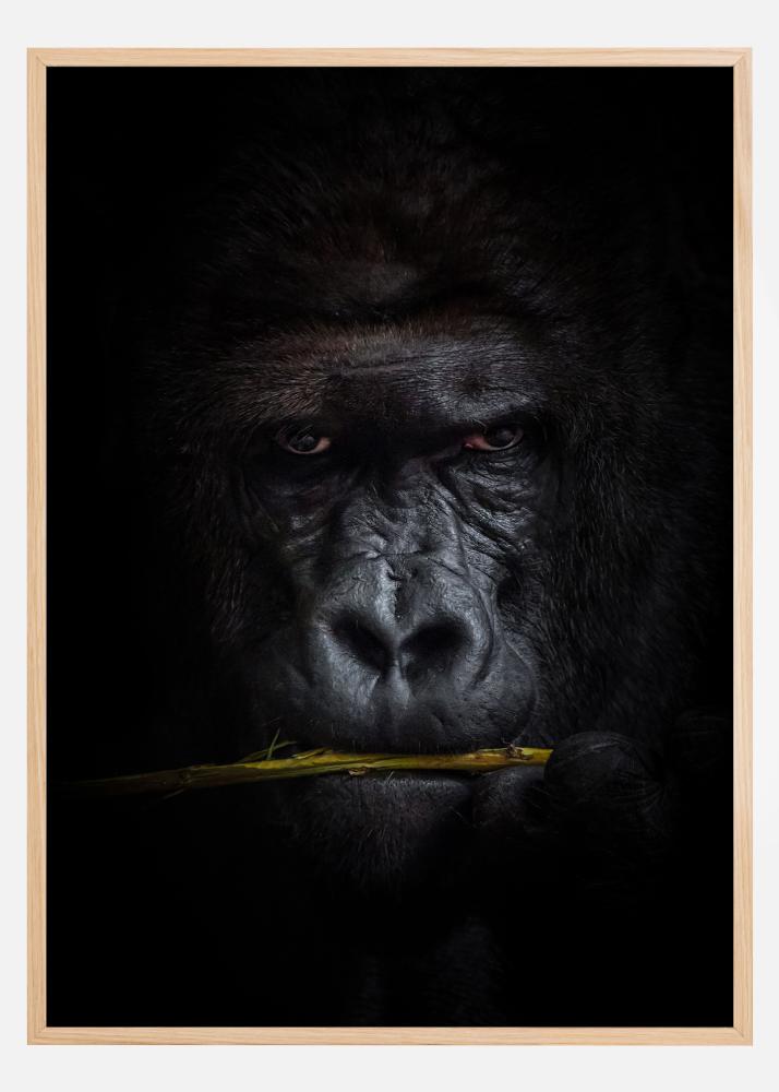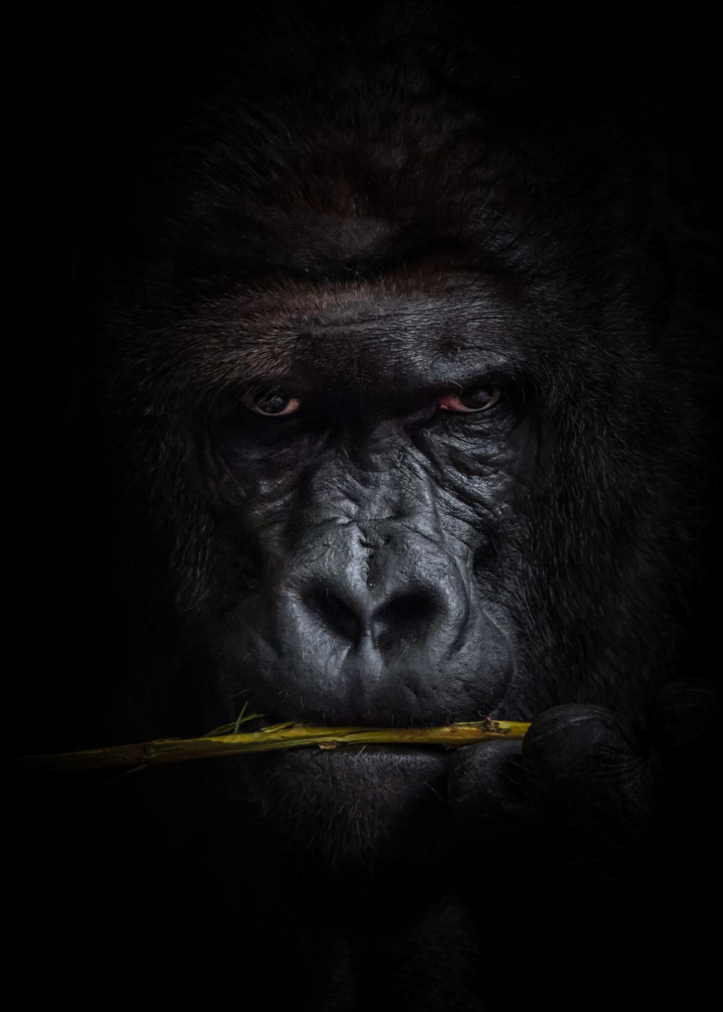Un retrato en primer plano de un gorila masticando la corteza de una rama. La mirada está dirigida hacia el fotógrafo y el pelaje oscuro se funde con el fondo negro, creando una hermosa profundidad en el motivo. Un poderoso póster con un encuentro íntimo con uno de los primates más grandes de la selva tropical.