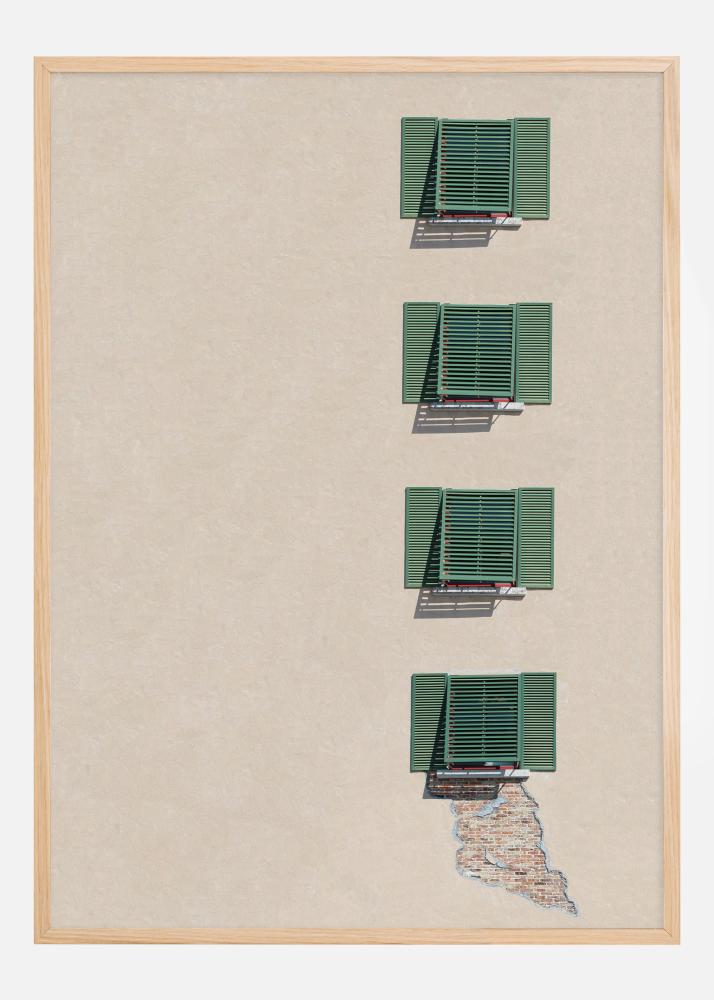 La obra, que puede titularse "Pelea de Vecinos", presenta un contraste radical entre orden y caos a través de las persianas sincronizadas en comparación con la última ventana donde una parte de la pared parece haber colapsado. Las persianas uniformes en verde contra el fondo de un solo color indican un tipo de previsibilidad y rutina, mientras que la ventana dañada con los ladrillos expuestos rompe con esta armonía e introduce una historia de posible conflicto o negligencia.