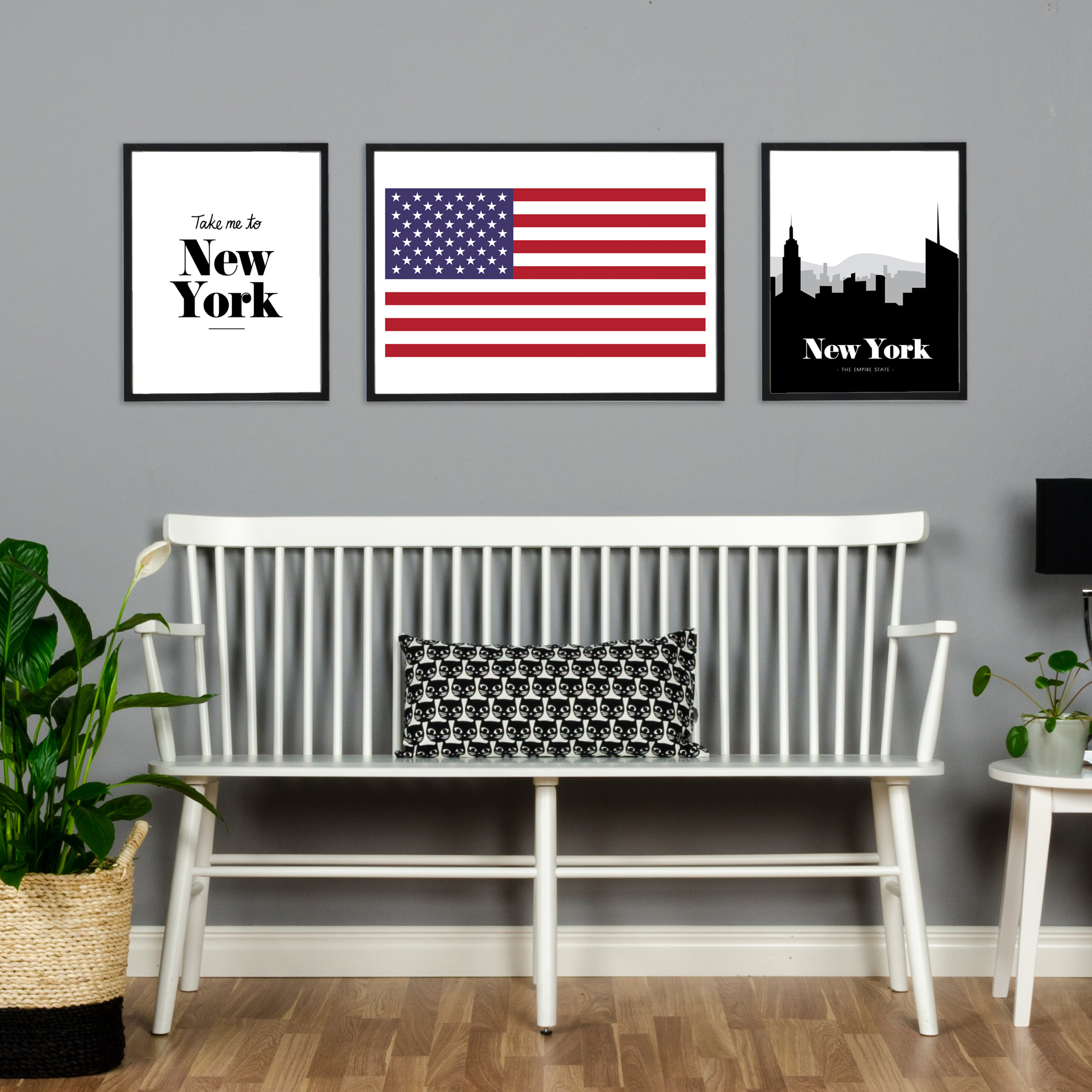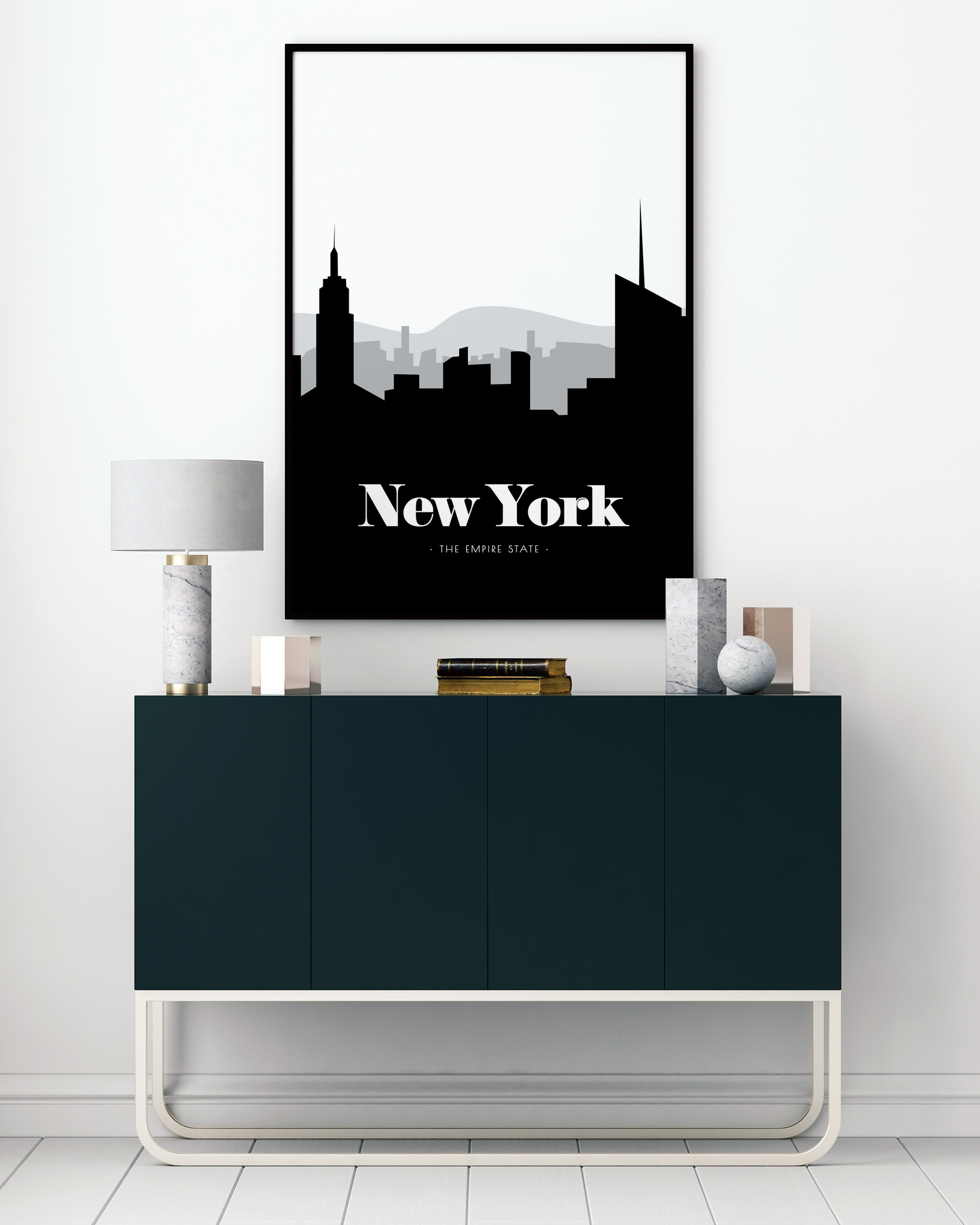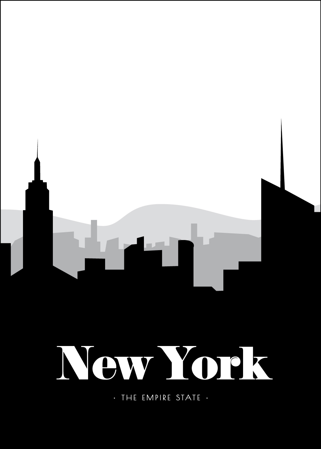 ¡La ciudad más animada, ruidosa y emocionante del mundo debe ser Nueva York! Celebra esta maravillosa metrópolis con este póster gráfico y haz que se convierta en un componente elegante en tu interior. El póster muestra siluetas en 3 capas diferentes, siendo la trasera de color gris y las 2 delanteras de un gris más oscuro y negro respectivamente. En la silueta delantera se pueden distinguir el Empire State Building y el Rockefeller Center, entre otros. Sobre el fondo negro, el texto "Nueva York, el estado del imperio" está impreso en blanco. La línea del horizonte de Nueva York está disponible en 6 formatos y rangos de precios diferentes. Se recomienda complementar con un marco blanco.