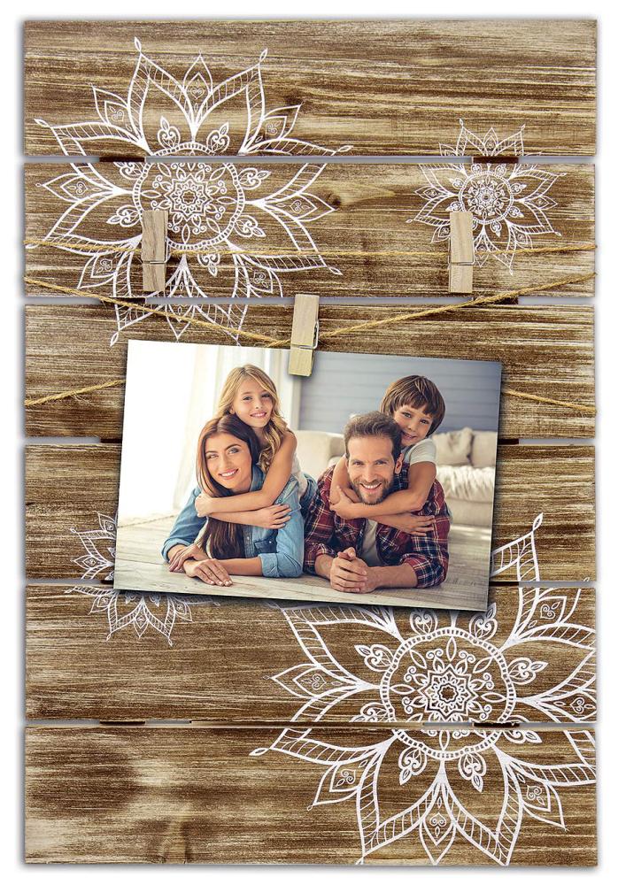 Esta es una bonita marco collage donde las imágenes se sujetan con ganchos de madera decorativas. Las imágenes se sujetan a un fondo de madera con flores pintadas de blanco en un diseño bohemio. El marco tiene espacio para dos imágenes de 10x15 cm. Las dimensiones exteriores del marco son de 32x48,5 cm. Este marco collage se puede combinar perfectamente en la pared con otros cuadros para crear una elegante unidad en tu hogar. Incluye soporte para colgar en la pared.