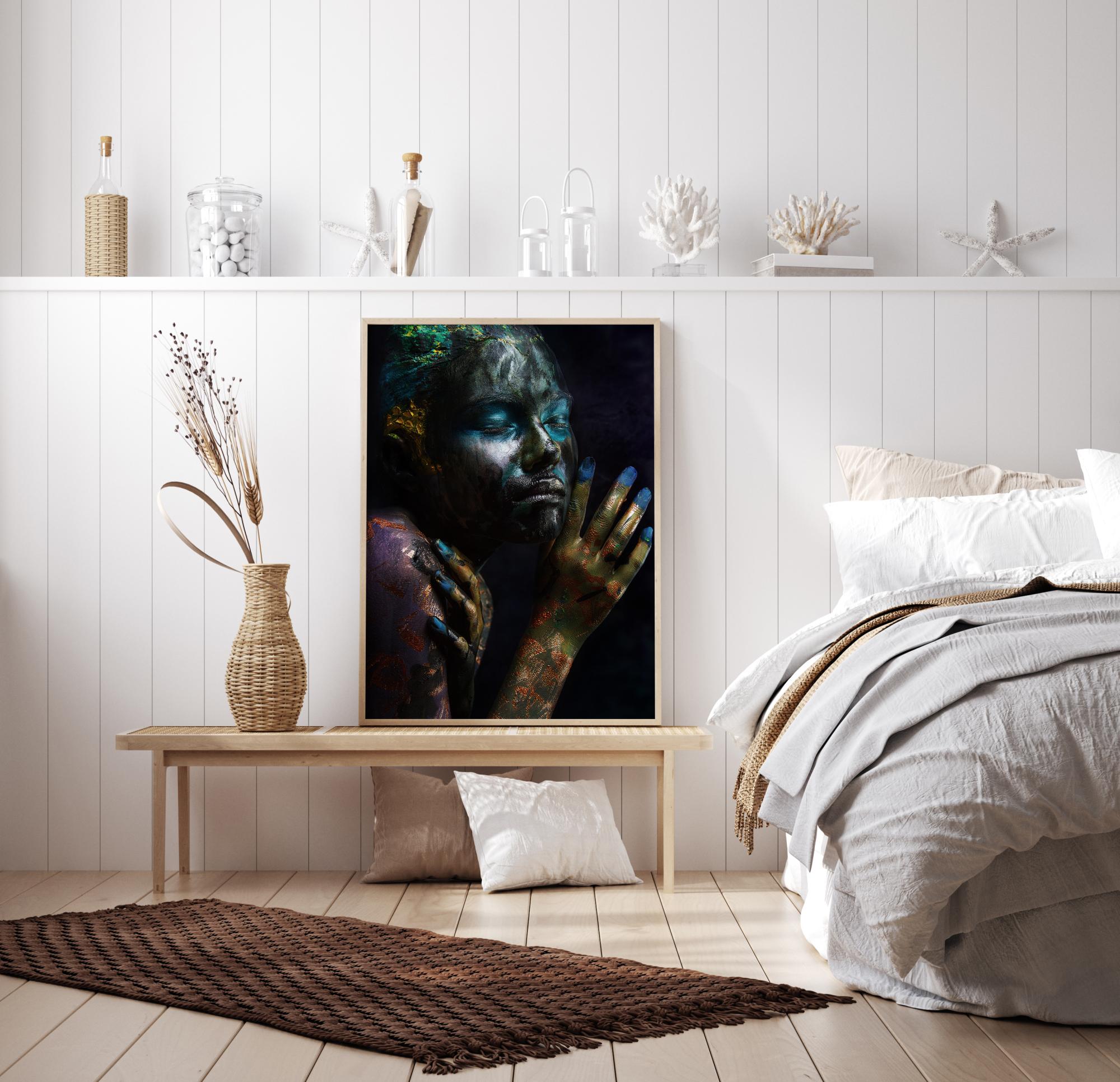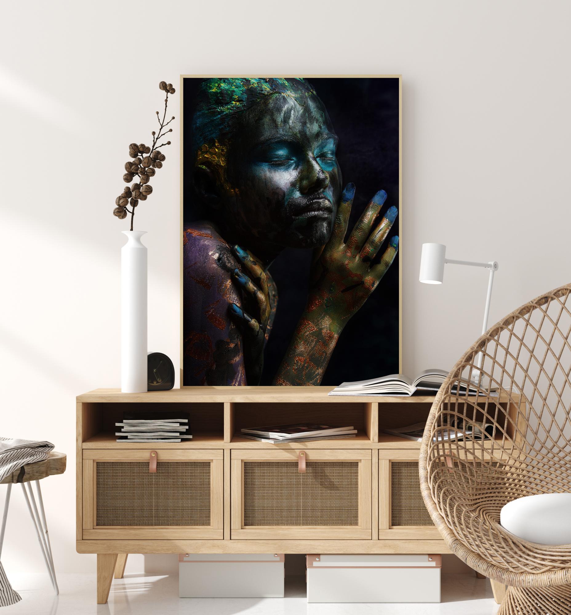 Una fascinante imagen de una mujer cubierta de colores. Sobre un fondo negro, la mujer está cubierta de colores brillantes. La intensidad de los colores se resalta con la luz natural que ilumina su rostro y hombros. Un hermoso póster que puede darle color a una pared blanca.