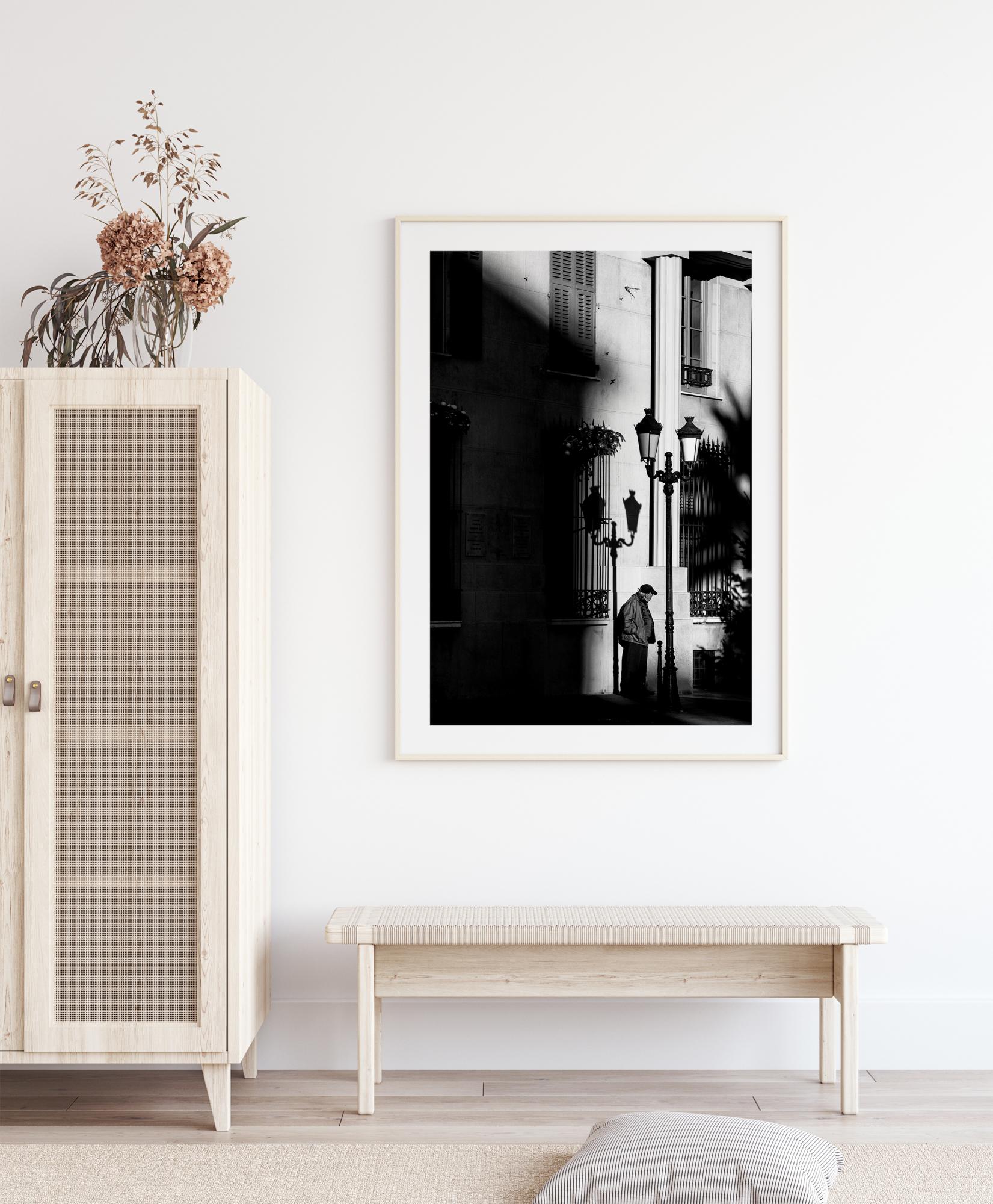 Una fotografía en blanco y negro de un hombre envejecido que, con una mirada de búsqueda, está parado y observando algo rodeado por las animadas sombras de la ciudad. Un póster tranquilo y bonito que se ve igual de bien solo como junto a otros favoritos en una galería de pared más grande.