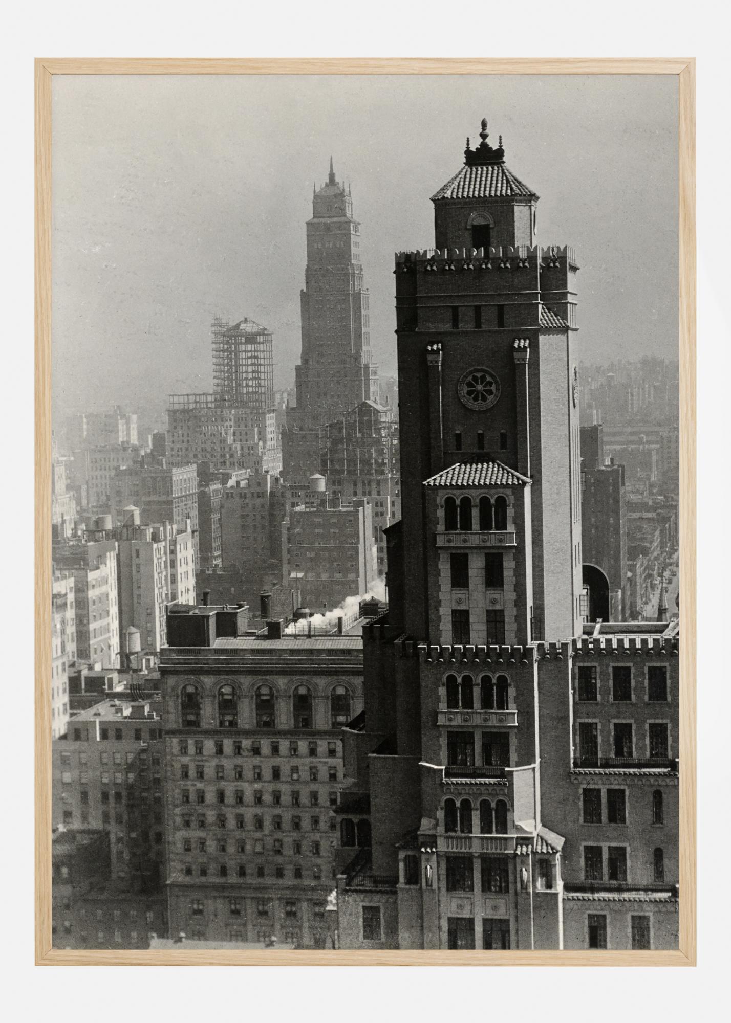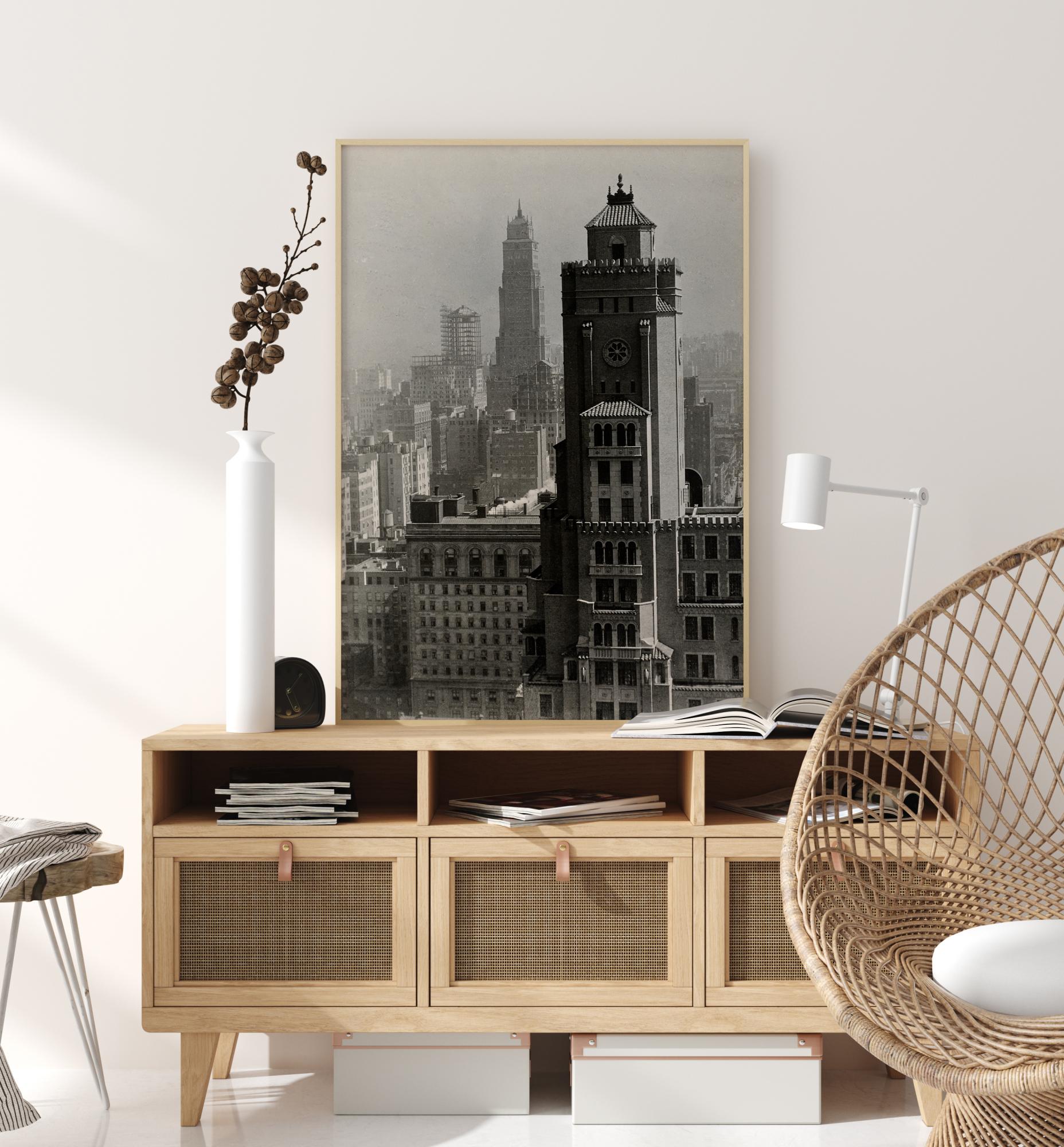 Una impresión en blanco y negro de una antigua ciudad. La línea gris de la ciudad se fusiona perfectamente con los edificios de color gris. La ciudad está compuesta por edificios de diferentes alturas. En primer plano, la luz natural brilla directamente en el lado este del edificio principal. Cuelga este póster en tu estudio y observa la antigua ciudad.
