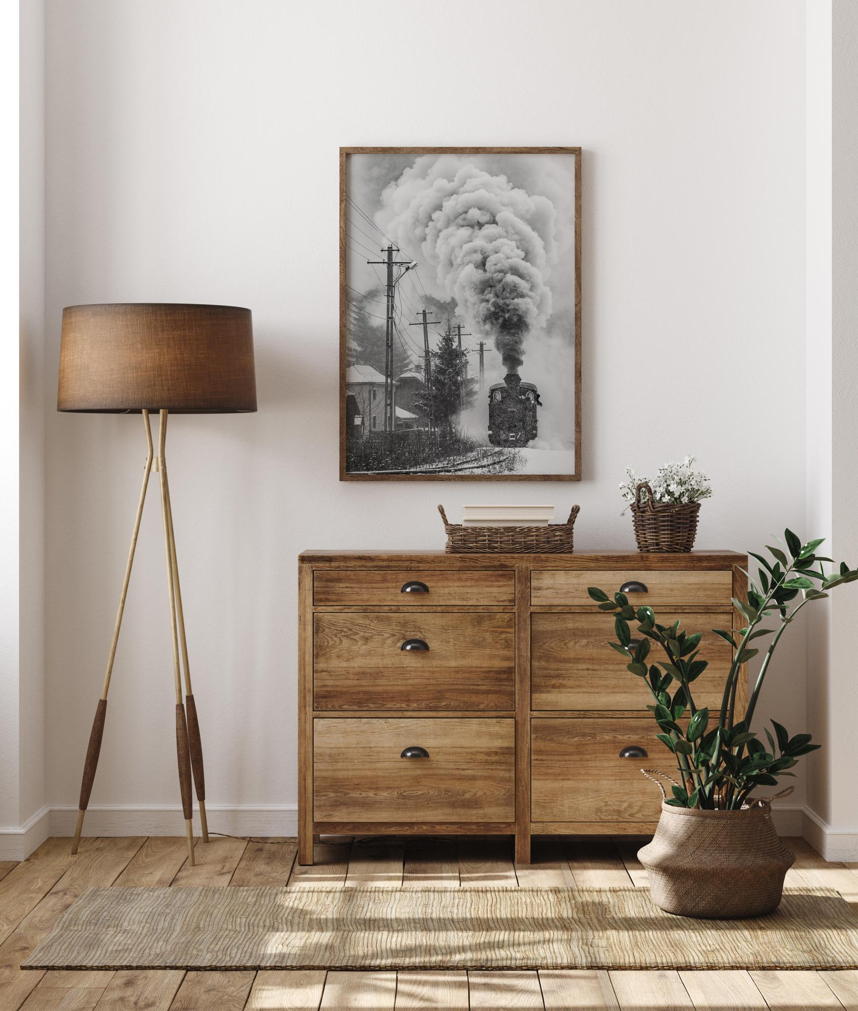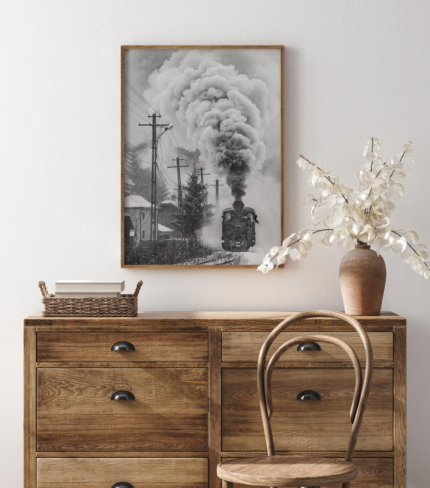 Un póster llamativo con un tren de vapor en la nieve. Déjate envolver por lo épico de esta foto mientras el humo se eleva alto. Obtén esa sensación navideña cuando cuelgues este póster en la pared.