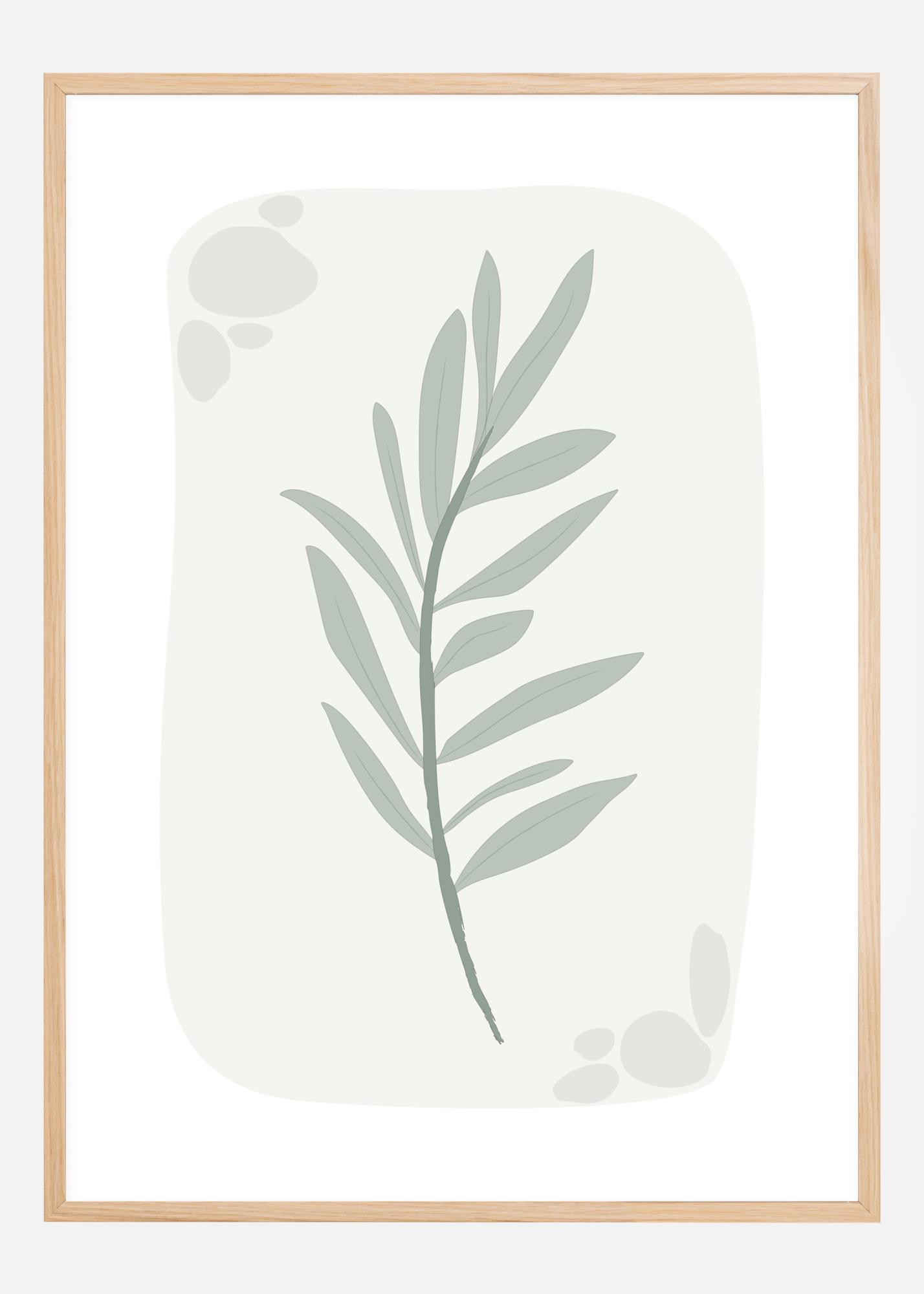 Una suave impresión de una hoja de olivo sobre un fondo blanco crema. Los tonos verdes suaves de la rama de olivo se mezclan perfectamente con el fondo. En la esquina superior izquierda y la esquina inferior derecha se han pintado cuatro piedras de color beige. Este póster se vería hermoso colgado en una pared blanca crema.