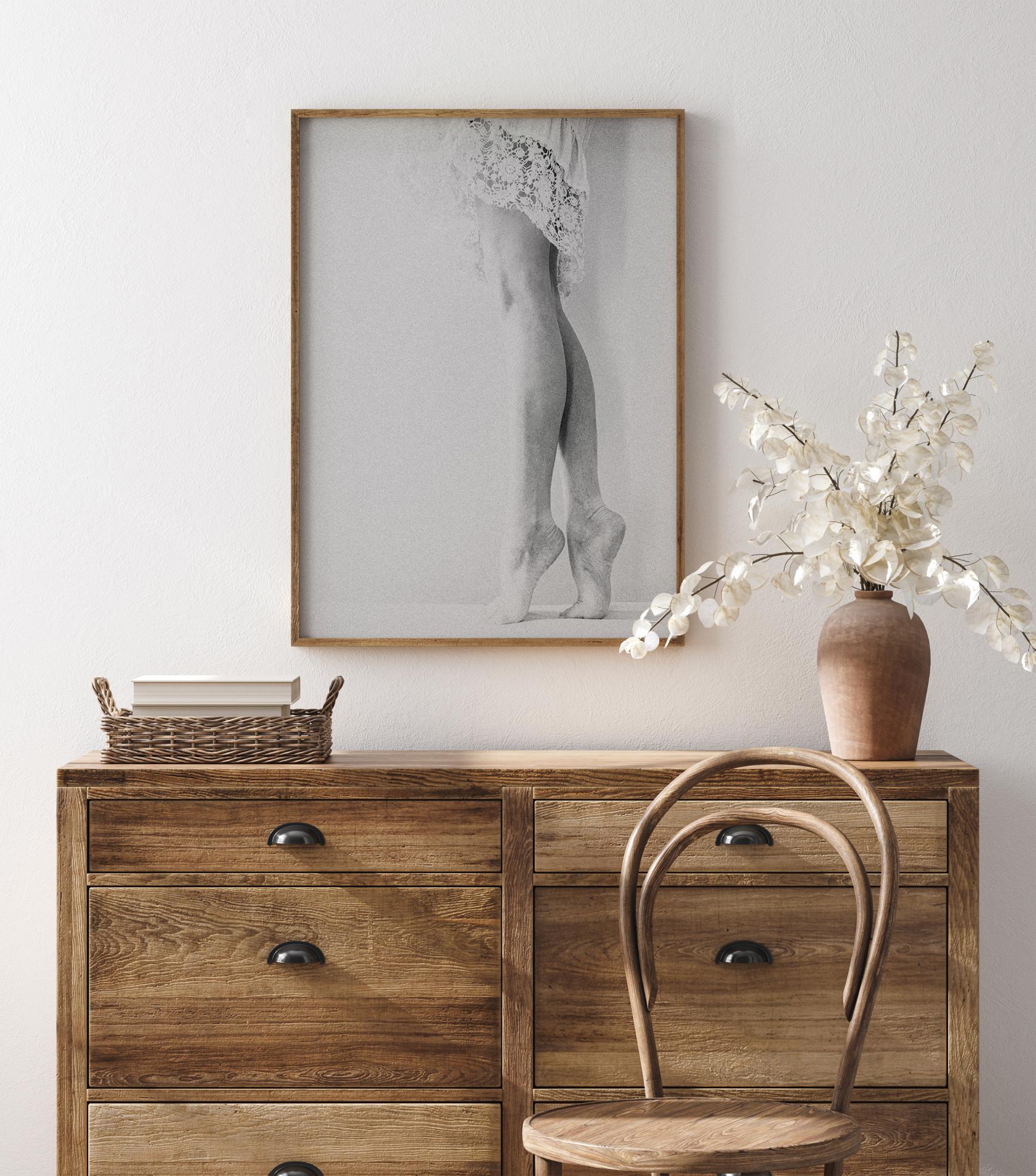 Un elegante medio retrato de una mujer de puntillas. La simplicidad de la imagen combinada con el sutil blanco hacen de esta imagen una excelente adición a tu dormitorio o sala de estar.