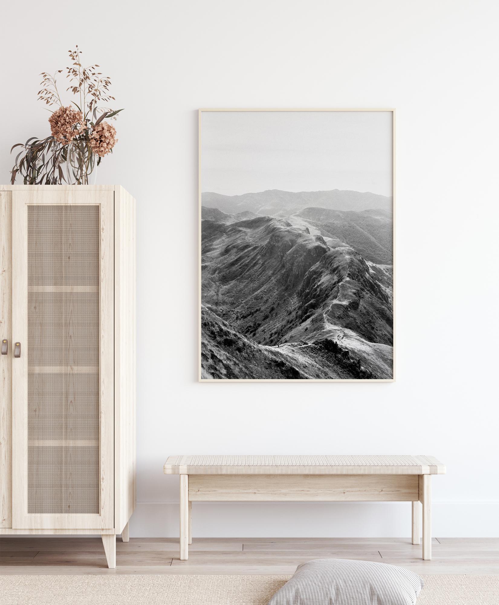 Un póster en blanco y negro con una cadena montañosa. Los diferentes tonos de gris se fusionan perfectamente entre sí. Sin signos de vegetación o vida, casi se puede escuchar el silencio en las cimas de las montañas. Cuelga esta impresión en una pared colorida y escucha el viento soplar.