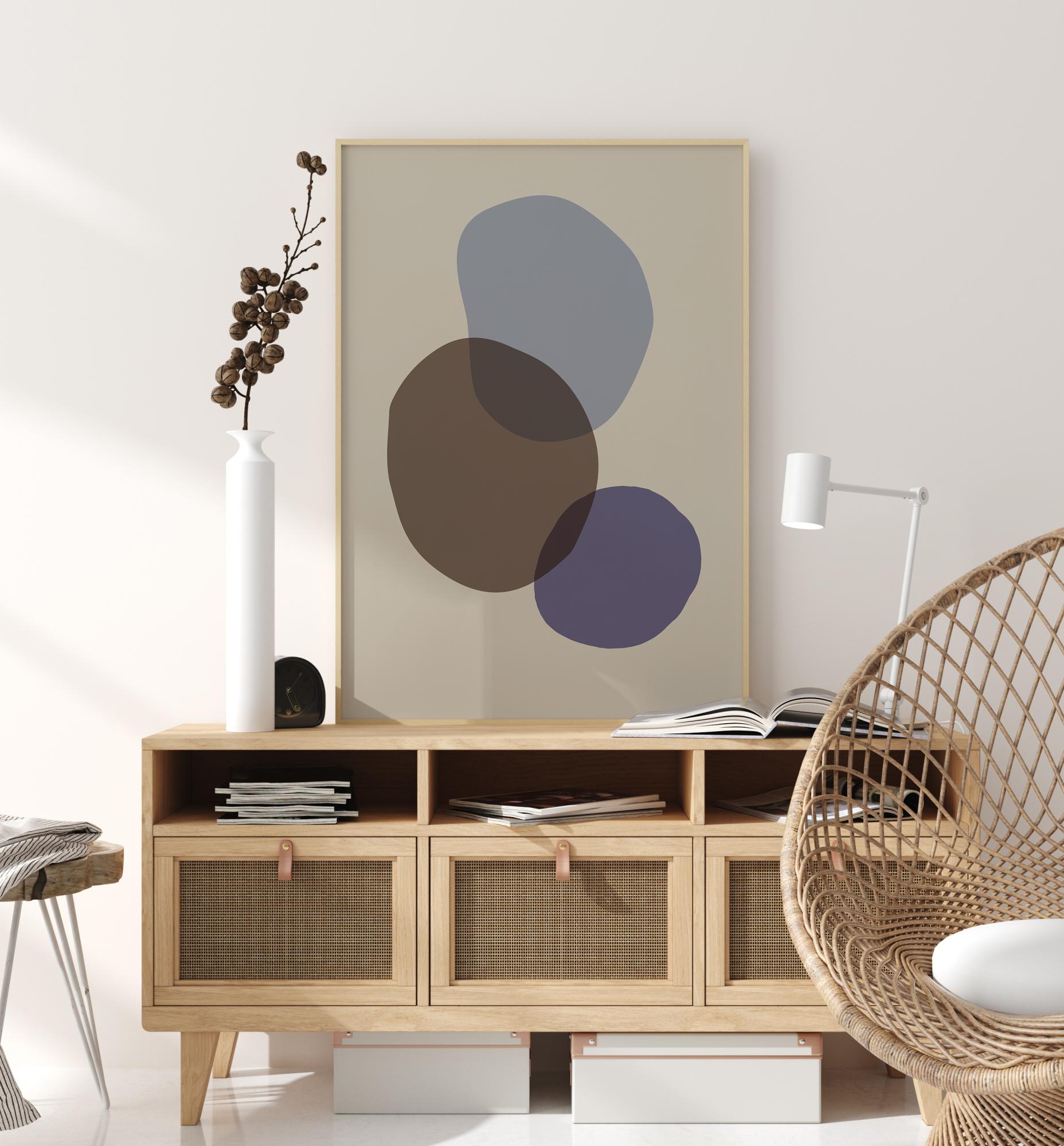 Un póster imaginativo con tres formas de colores diferentes. En un fondo crema, las formas marrón, gris y lila se superponen entre sí. La forma marrón domina sobre las formas más pequeñas de color lila y gris. Una lámina sencilla para colgar en tu hogar. Usa tu imaginación para ver qué representan las formas.