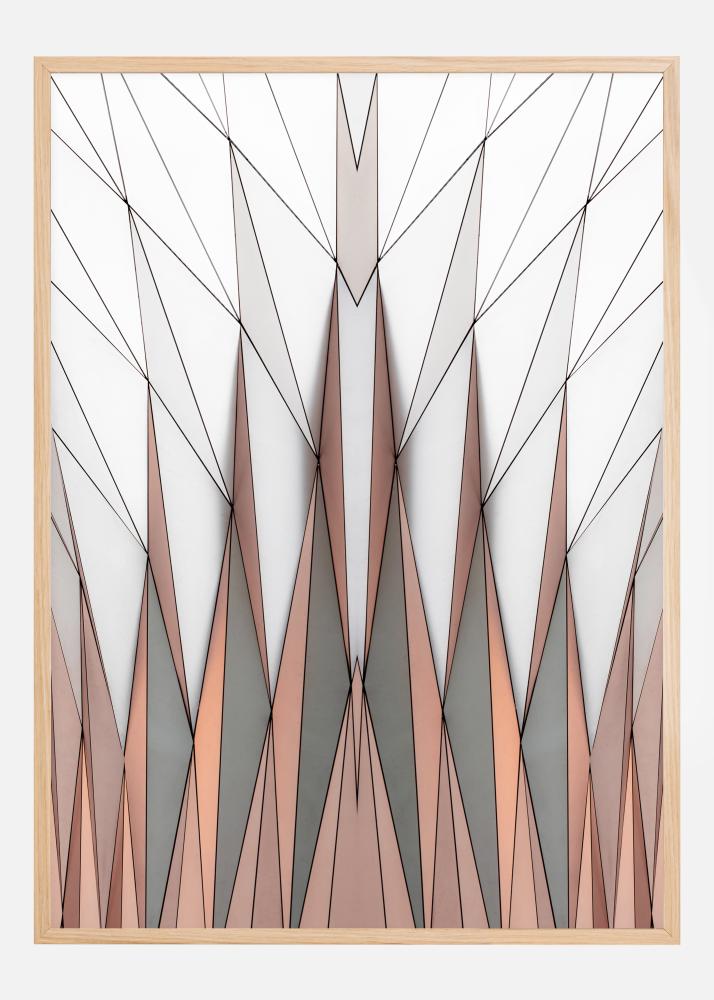 Una hermosa impresión de triángulos. Los triángulos de color naranja y gris están ubicados en la parte inferior de la impresión y apuntan hacia arriba. Sin embargo, los triángulos de forma de diamante restantes cubren la mitad superior de la impresión. Un póster fantástico cuando quieres tener una sensación de espacio. Perfecto para una pared de sala de estar.