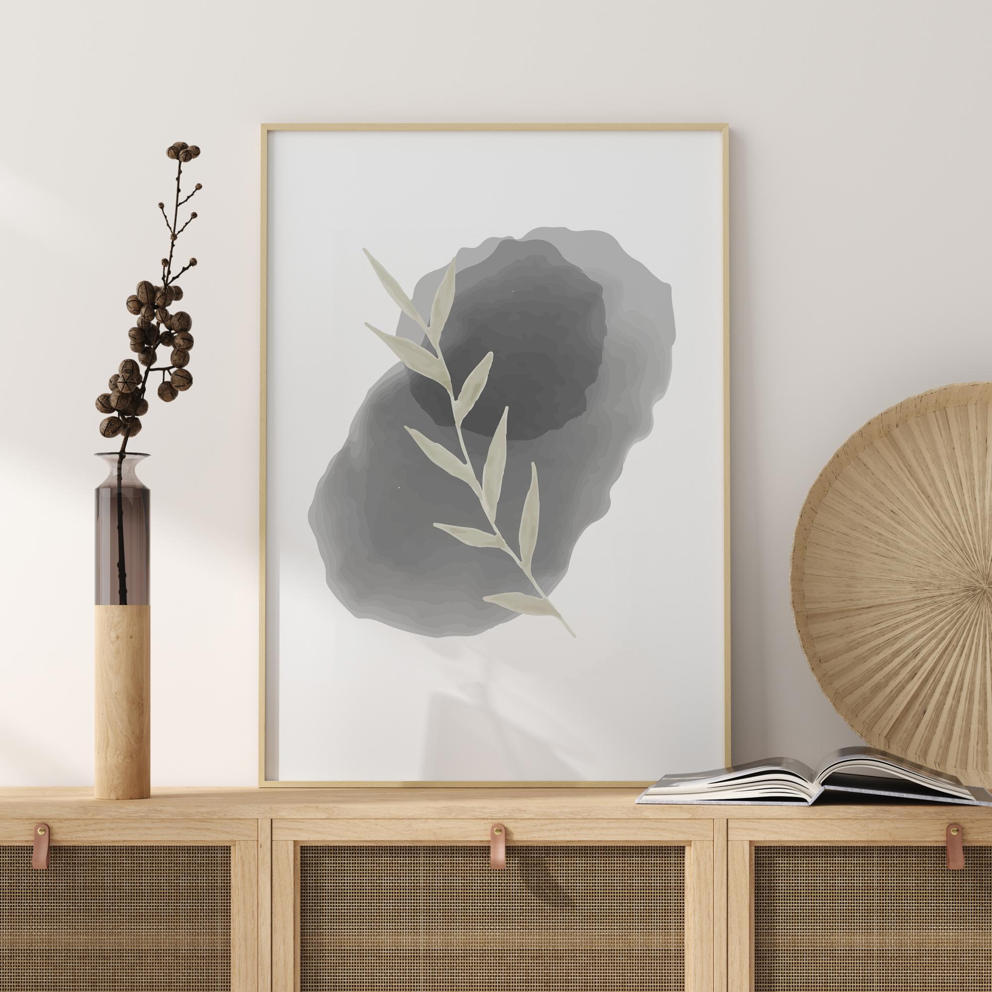 Una sencilla impresión de una hoja de color beige colocada sobre una piedra de forma ovalada. Sobre un fondo blanco, la hoja se encuentra sobre dos piedras diferentes: una pequeña piedra negra colocada sobre una piedra de color beige más grande. Dale a tu hogar un toque de delicadeza con este póster.