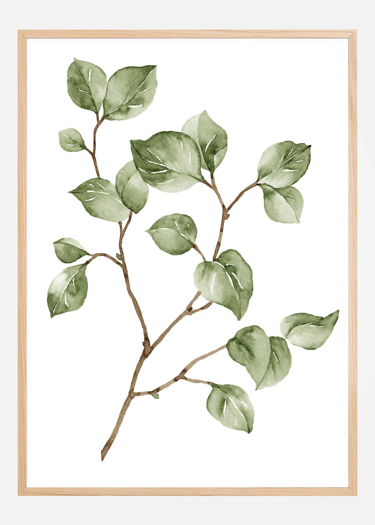 Un hermoso póster con una fina rama marrón con pequeñas hojas verdes. Pintado sobre una superficie blanca, resalta los suaves colores marrones y verdes y las delicadas venas blancas de las hojas. Una hermosa impresión para colgar en una pared verde claro.