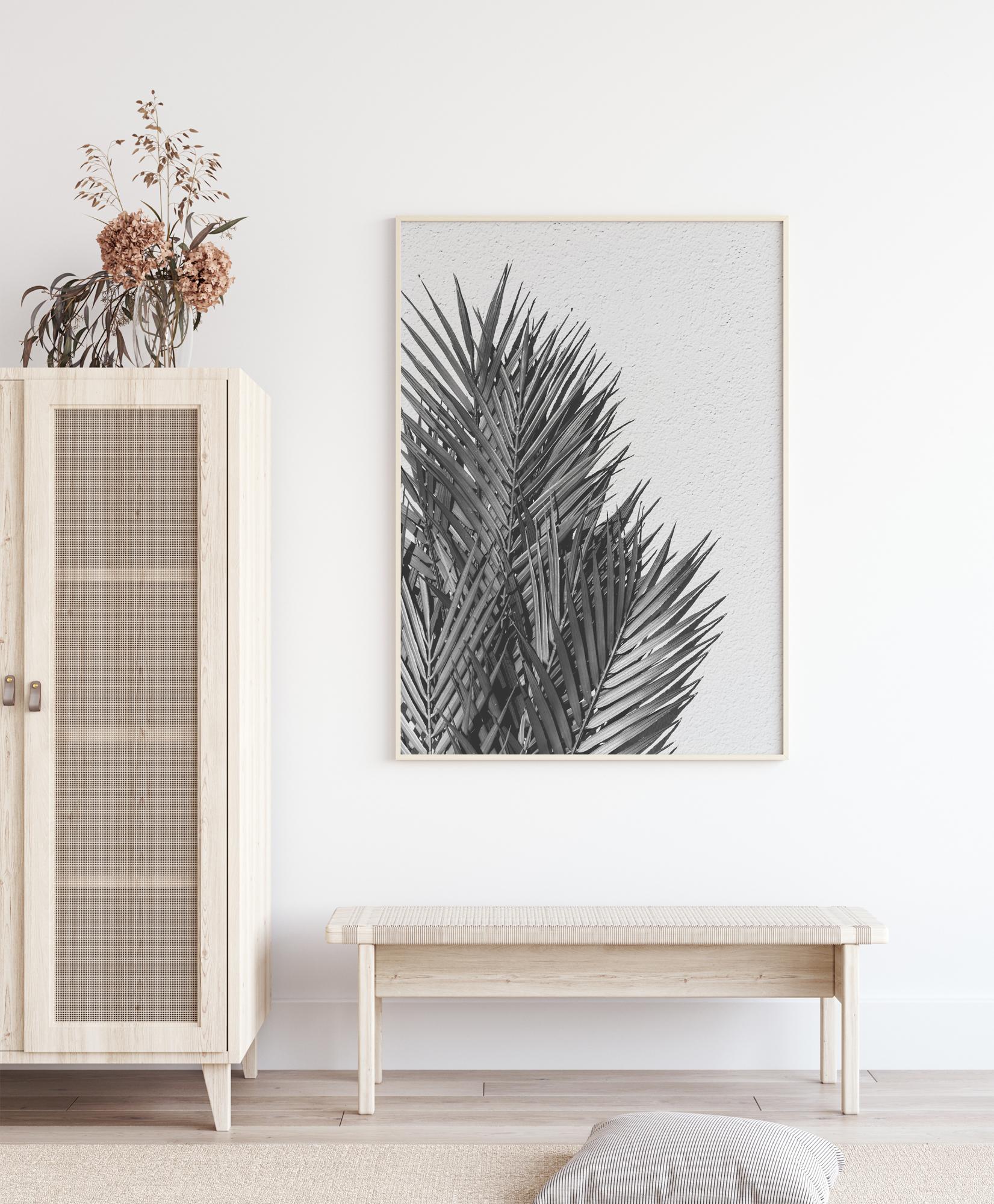 Un póster en blanco y negro con hojas de palma apoyadas en una pared blanca y áspera. La pared áspera resalta las hojas de palma que se superponen. Cuando te paras a la izquierda de la imagen, casi puedes sentir cómo el calor alcanza las hojas. Cuelga esta impresión en tu casa de verano para crear una atmósfera tropical.