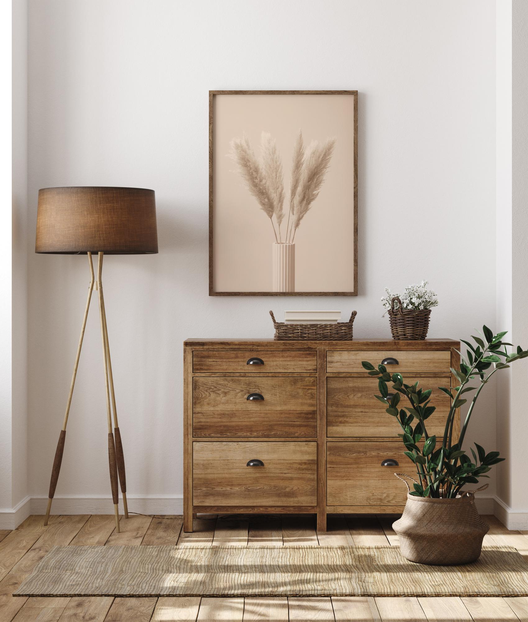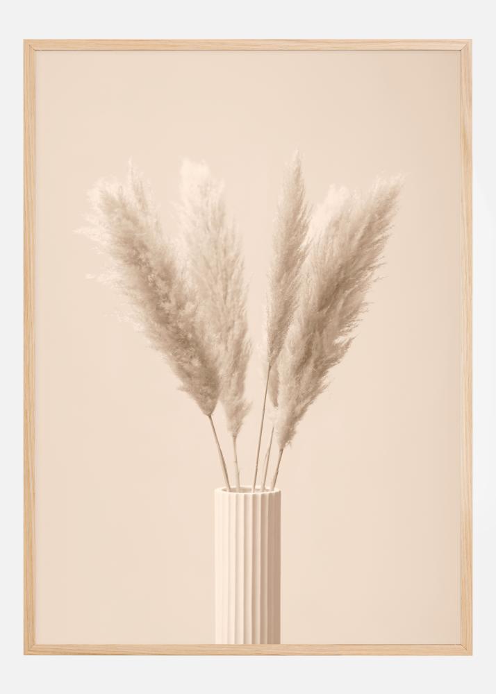 Un póster de flores con hierba de pampa en un jarrón. Las cabezas de hierba sobresalen sobre un fondo sepia rosa, lo que crea una sensación de suavidad donde el jarrón es lo duro. Esta imagen aporta un toque de elegancia al hogar.