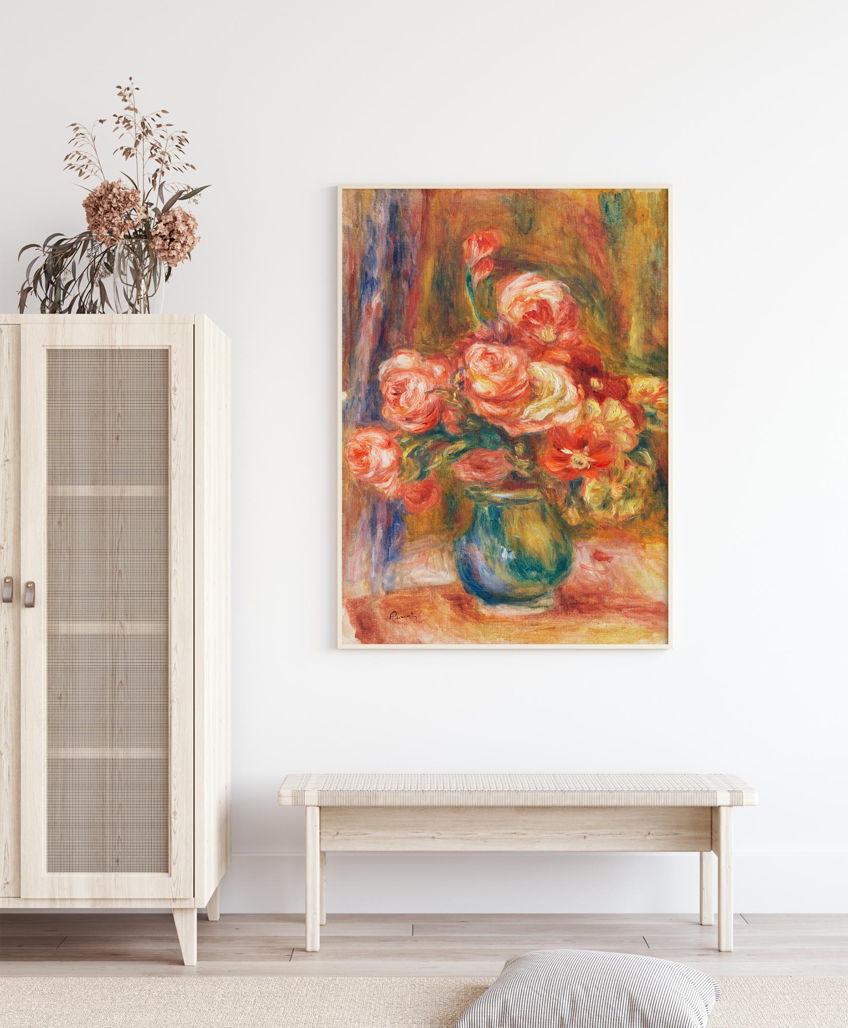 Un hermoso ramo de rosas pintado a mano. Esta fantástica lámina de rosas naranjas y rojas en un jarrón verde y colorido crea una sensación cálida y calmante. La combinación de colores sobre un fondo multicolor se fusiona perfectamente. Haz que tu hogar brille con la ayuda de este encantador póster.