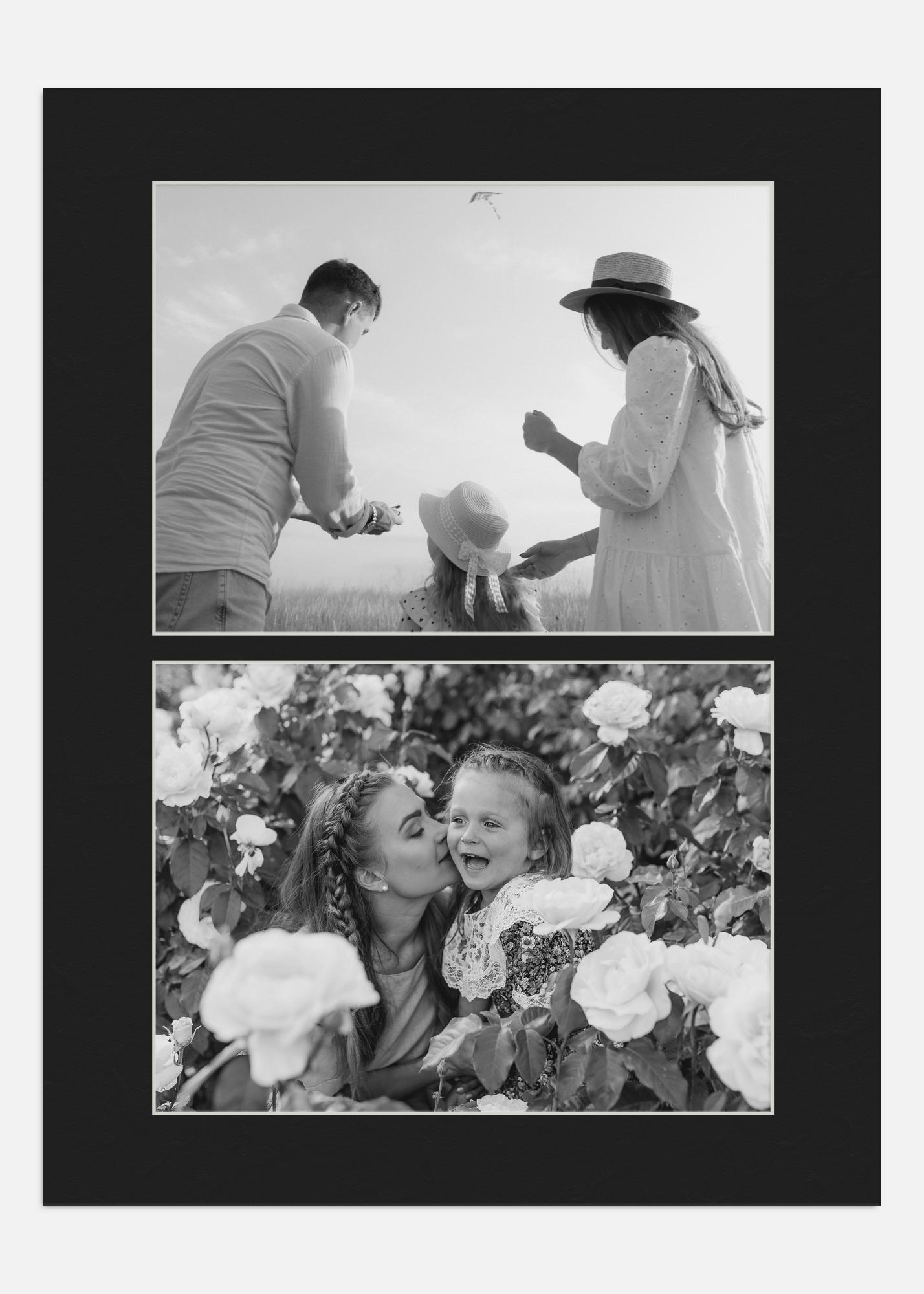 paspartú de collage negro libre de ácido con bordes blancos biselados de la más alta calidad. En el paspartú hay espacio para 2 imágenes. Perfecto cuando quieres hacer tu propio fotocollage.