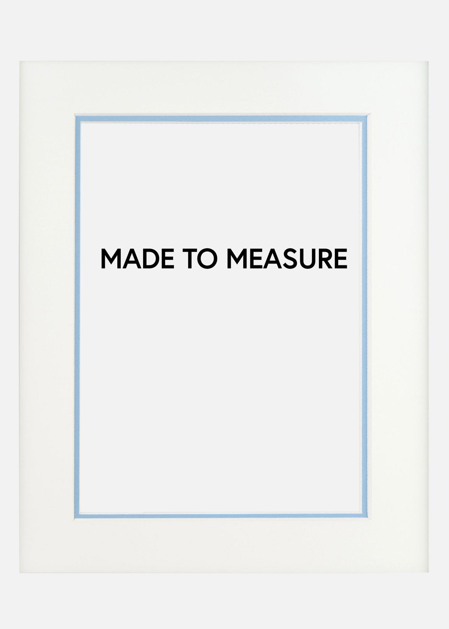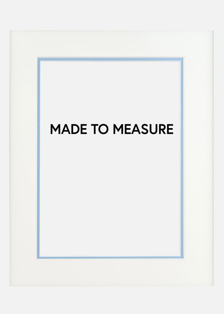 paspartú personalizado a medida en dos capas con un paspartú blanco como base y una capa inferior en azul claro que proporciona un borde de color de 5 mm alrededor de la imagen. Perfecto cuando quieres crear un enmarcado llamativo que resalte tu imagen y le dé una mayor profundidad al motivo. Todos nuestros paspartús tienen bordes cortados en un ángulo de 45 grados, lo que proporciona un enmarcado serio y profesional para tus imágenes.