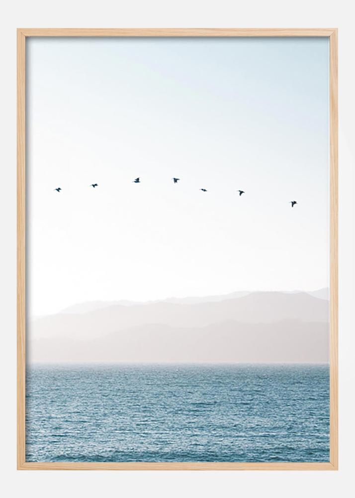 Una hermosa fotografía de la naturaleza de aves flotando sobre agua azul hacia un fondo de montañas cubiertas de niebla y un cielo blanco. Un póster tranquilo y armonioso en tonos refrescantes que se adapta tanto al baño como al dormitorio o la sala de estar.