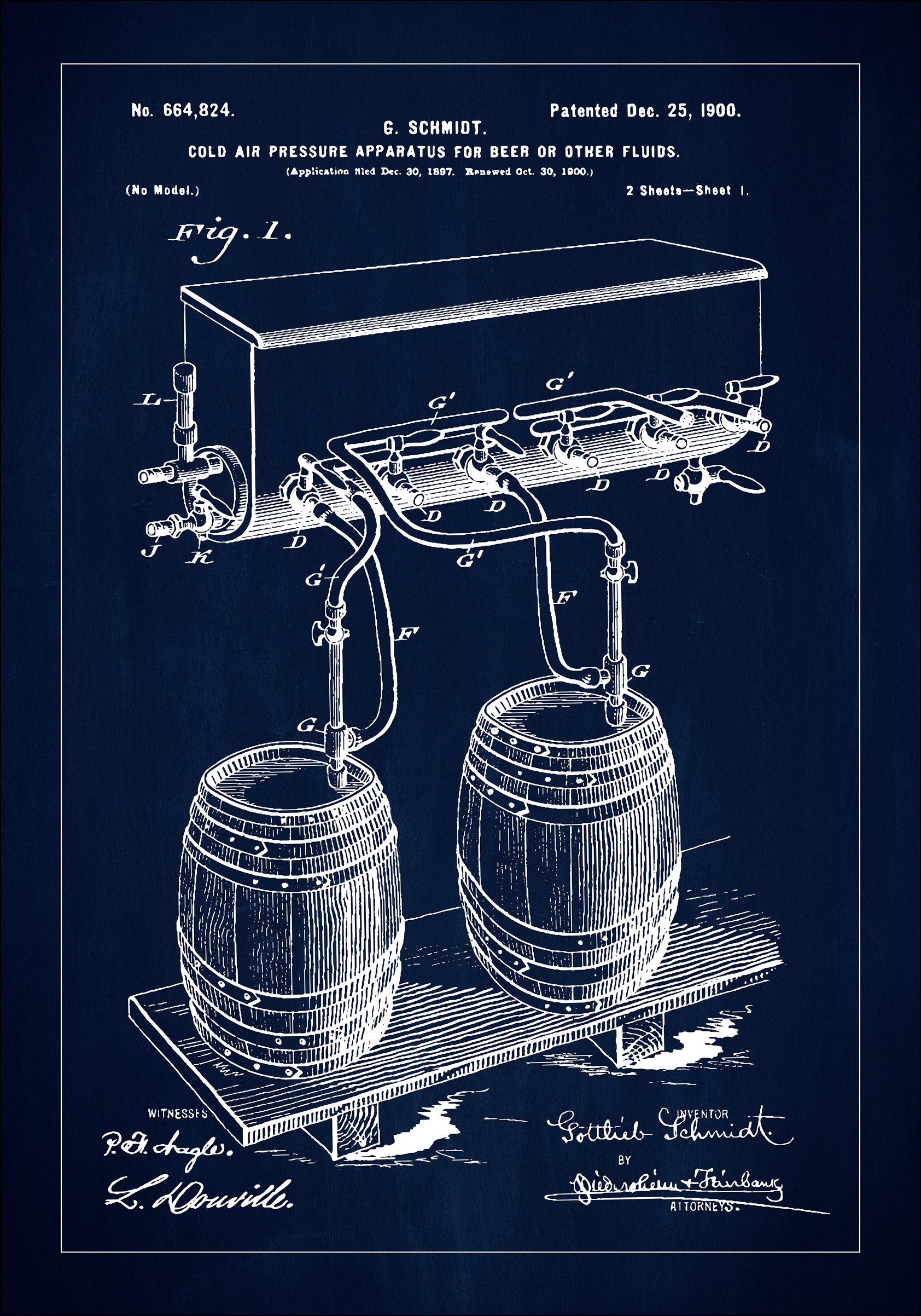 Esta sofisticada lámina de patente muestra un diseño innovador del 25 de diciembre de 1900, número de patente 664,824, desarrollado por G. Schmidt. El motivo ilustra un aparato de presión de refrigeración para cerveza u otros líquidos, una invención que revolucionó el manejo y servicio de bebidas. El dibujo patentado meticulosamente detallado resalta los componentes del sistema como contenedores, tuberías y mecanismos de ventilación, convirtiéndolo en una obra de arte de brillantez técnica. La ilustración en blanco y negro sobre el fondo azul profundo ofrece un contraste estéticamente atractivo que cautiva la vista e inspira la mente.