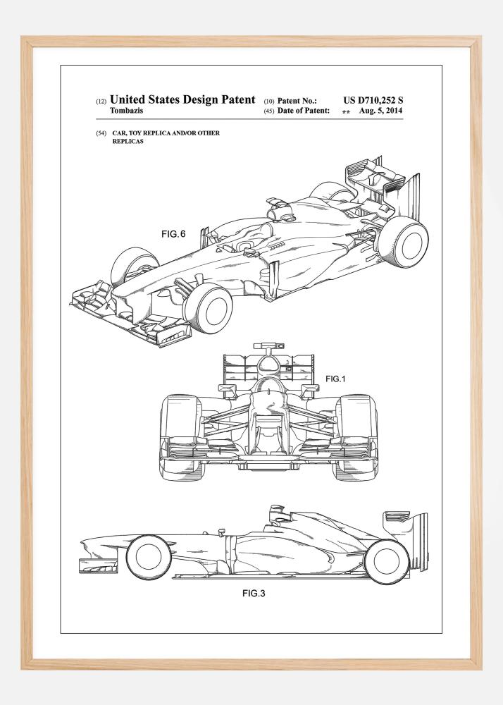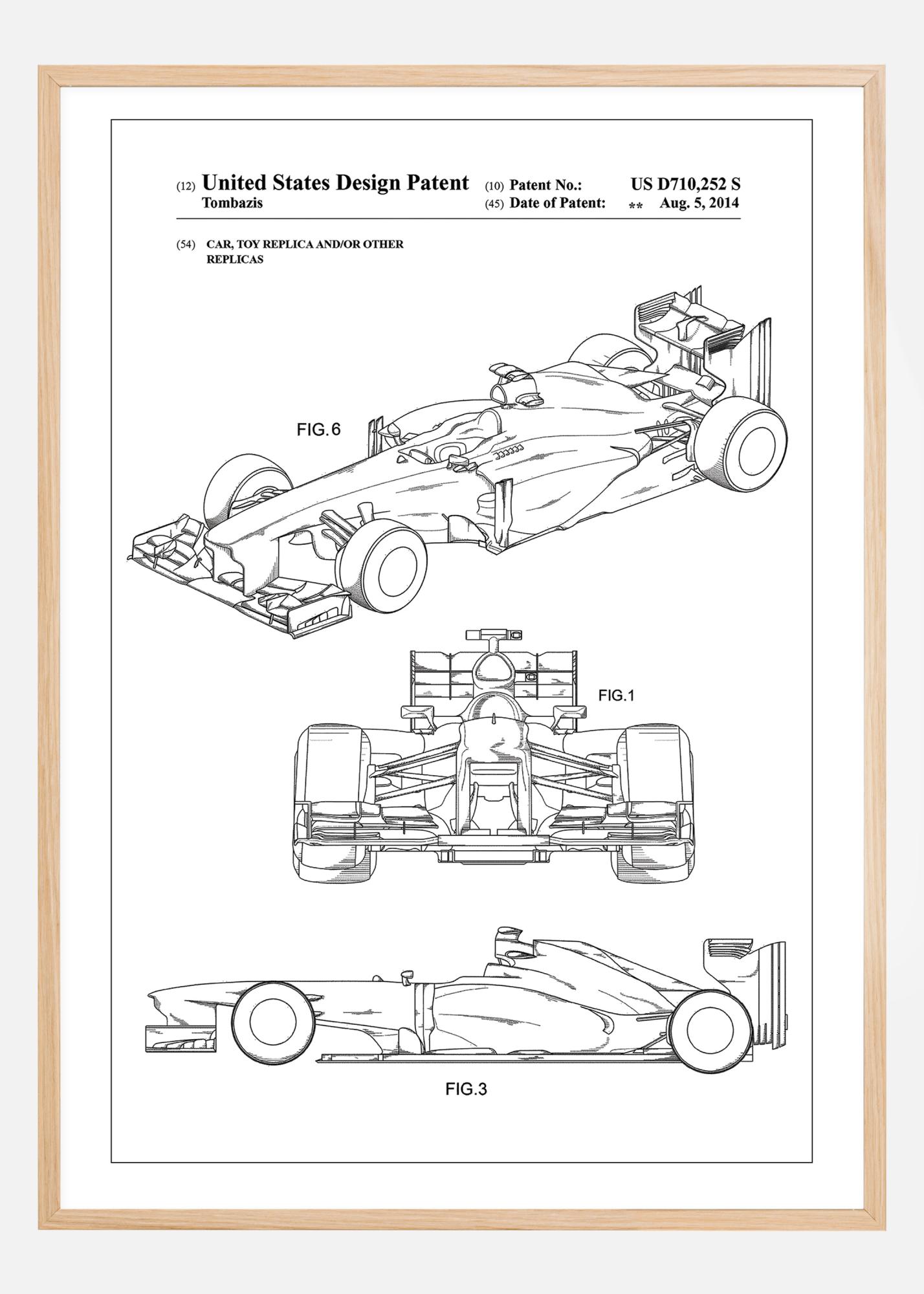 El póster de patente es un excelente elemento decorativo para los entusiastas del automovilismo, coleccionistas de coches de carreras, o como una pieza artística única en un hogar o oficina. Captura el espíritu de velocidad y precisión técnica, que es la esencia de las carreras de fórmula y su rica historia de diseño e innovación.
