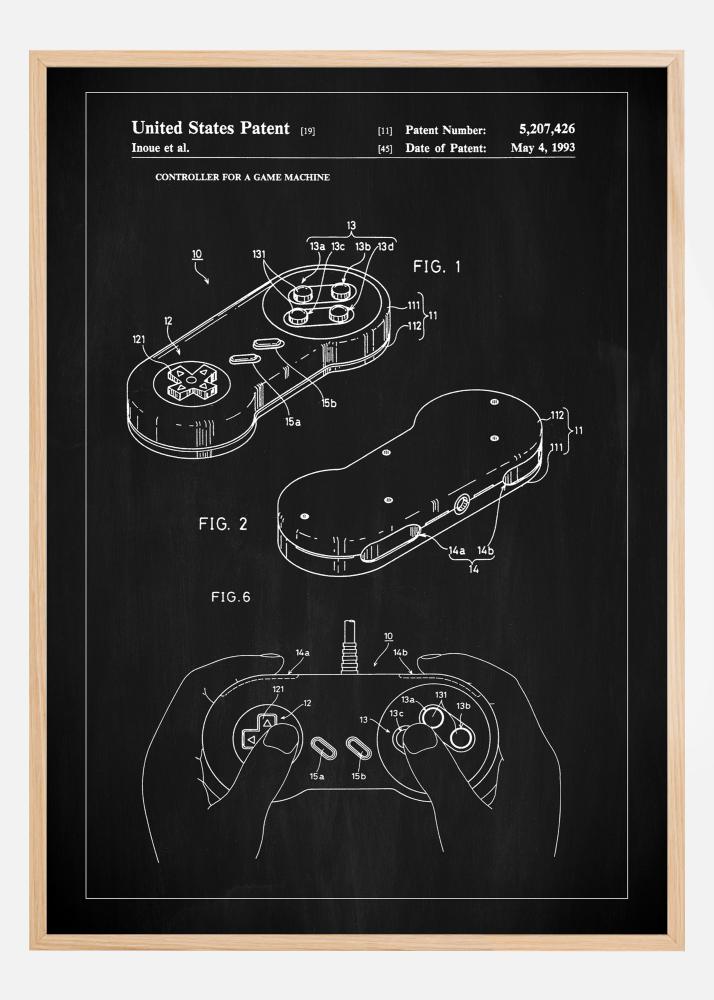 Este póster de patente destaca un diseño clásico de un controlador de juego para Nintendo, número de patente 5,207,426, fechado el 4 de mayo de 1993, sobre un elegante fondo de pizarra negra. El dibujo de la patente muestra diferentes vistas del controlador, incluyendo la parte superior, inferior y la perspectiva del usuario, detallando la configuración de botones y palancas que se han convertido en elementos centrales en la interacción de los jugadores con los mundos digitales de juegos.