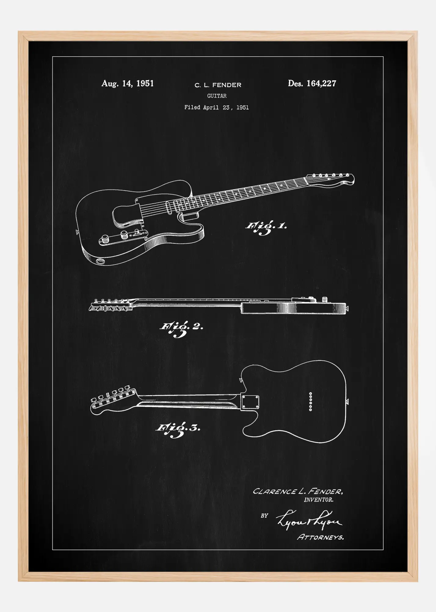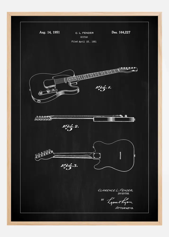 Este póster de patente con fondo de pizarra negra ofrece un fuerte efecto visual, perfecto para resaltar el diseño de la guitarra eléctrica de Clarence L. Fender, número de patente 164,227 del 14 de agosto de 1951. Los contornos icónicos y los detalles de la guitarra se destacan nítidamente contra el fondo, proporcionando una representación clara y distintiva del instrumento desde tres perspectivas diferentes.