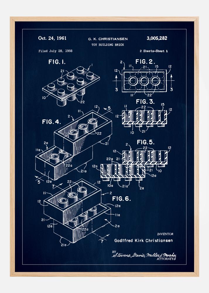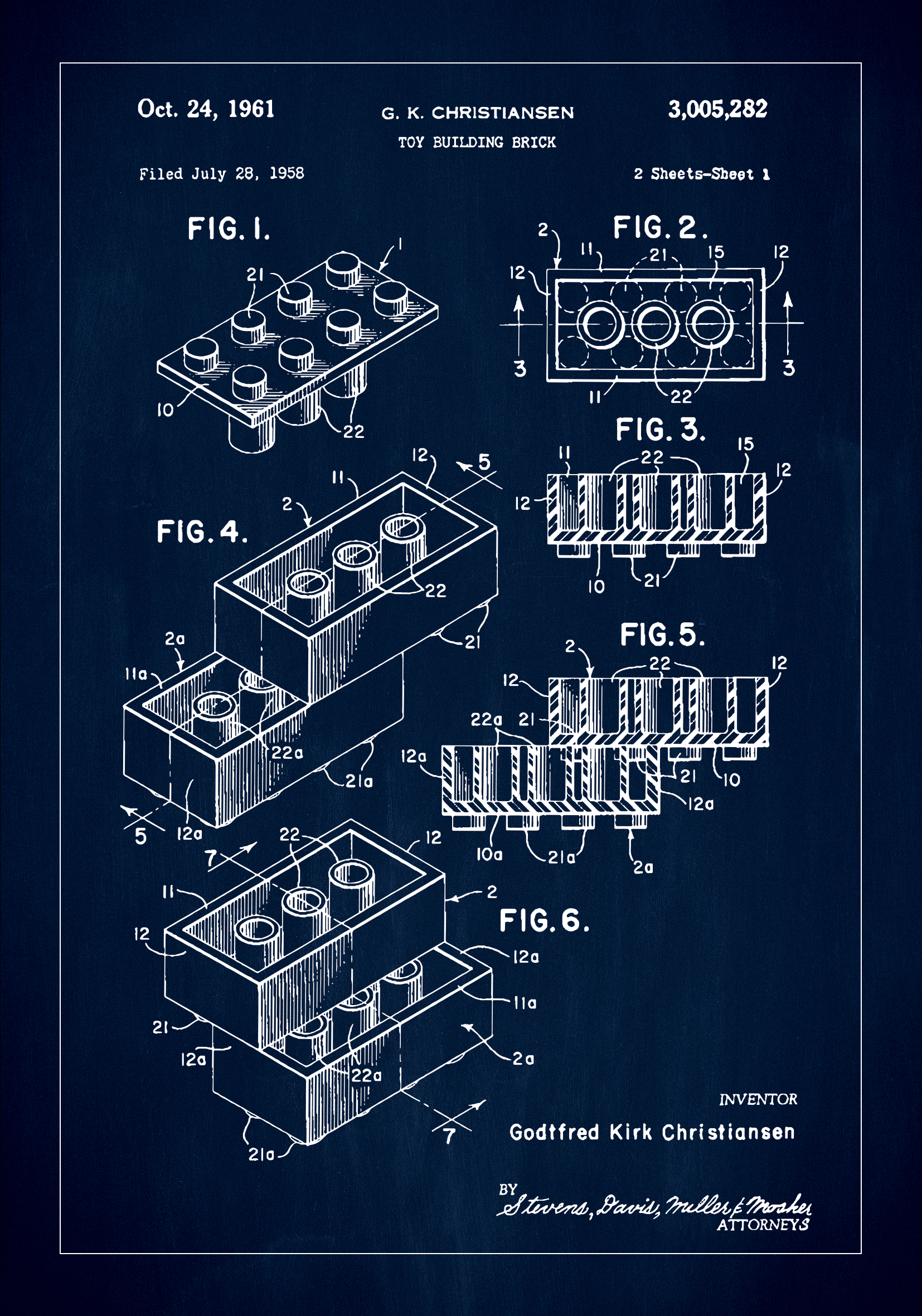 Este póster de patente detallado retrata el ingenioso diseño del bloque de construcción de juguete de Lego que transformó el juego creativo y el aprendizaje, creado por Godtfred Kirk Christiansen. Con el número de patente 3,005,282, concedido el 24 de octubre de 1961, esta ilustración captura la esencia de una invención que ha inspirado y alegrado a generaciones de constructores y pensadores.