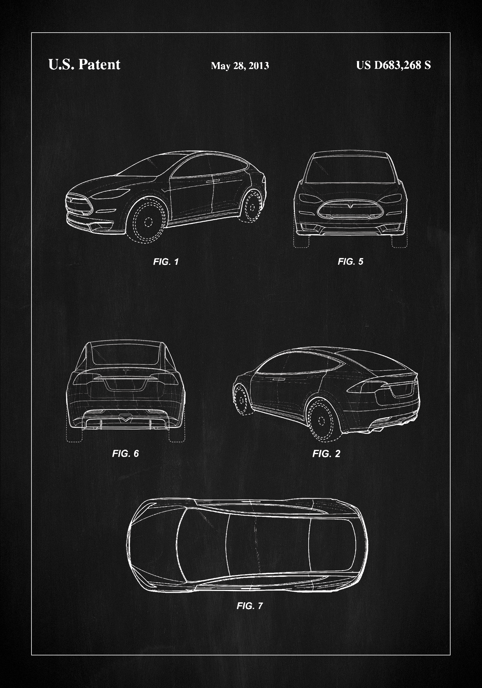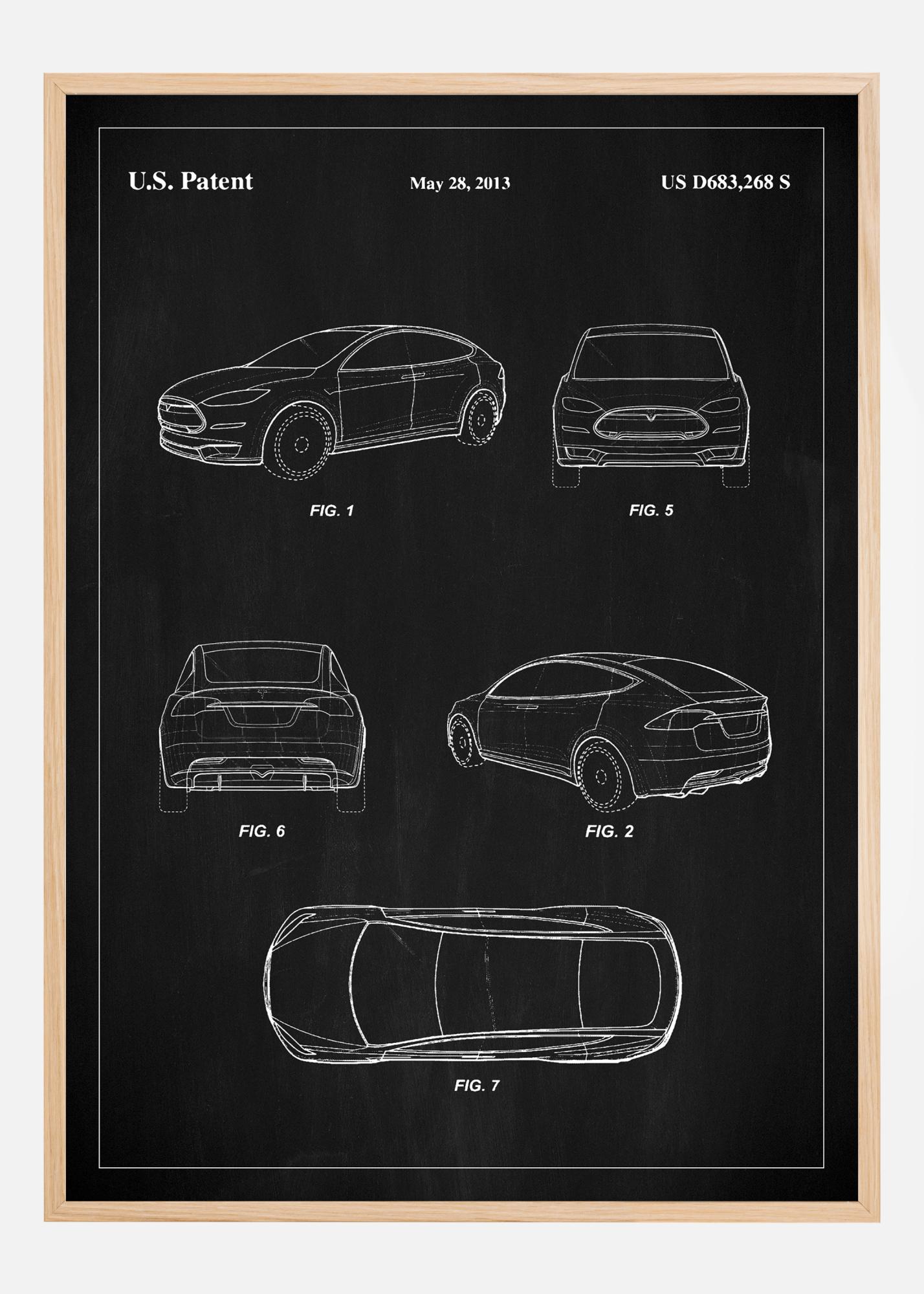 Este elegante y sofisticado póster de patente es un homenaje al diseño automotriz moderno de un Tesla, documentado a través de la patente estadounidense con el número US D683,268 S el 28 de mayo de 2013. El póster muestra una escultura vehicular distinta que define la vanguardia en la fabricación de automóviles. Cada línea y curva está cuidadosamente delineada en blanco sobre el fondo negro, creando un contraste magnífico que captura y mantiene el interés del espectador.