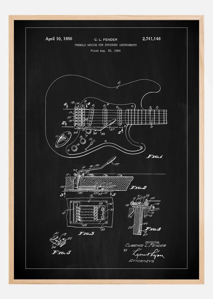 Con su presentación original en una clásica pizarra negra, este dibujo de patente destaca el diseño innovador que cambió la forma en que se tocan las guitarras. La patente, que se presentó por primera vez el 30 de agosto de 1954, se ilustra con precisión y cuidado, creando una obra de arte que es tanto informativa como inspiradora. Un regalo ideal para guitarristas, historiadores de la música o aquellos que aprecian la artesanía clásica, este póster seguramente será una parte apreciada de cualquier colección.
