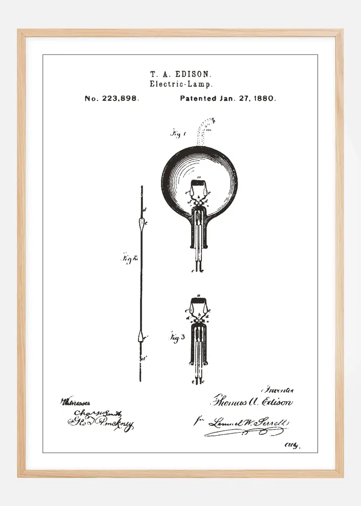 Este atemporal póster de patente muestra la innovadora lámpara eléctrica de Thomas A. Edison, que ha iluminado nuestras vidas desde que obtuvo el número de patente 223,898 el 27 de enero de 1880. Este elegante y educativo póster es un homenaje a una de las mayores invenciones de todos los tiempos y ofrece una visión única de la innovación tecnológica. Los detalles del dibujo revelan el cuidadoso proceso detrás de la invención de la bombilla, un producto que es central en nuestras vidas diarias. Este póster es un fantástico iniciador de conversaciones y una fuente de inspiración, perfecto para todos los que aprecian la tecnología y el diseño históricos.