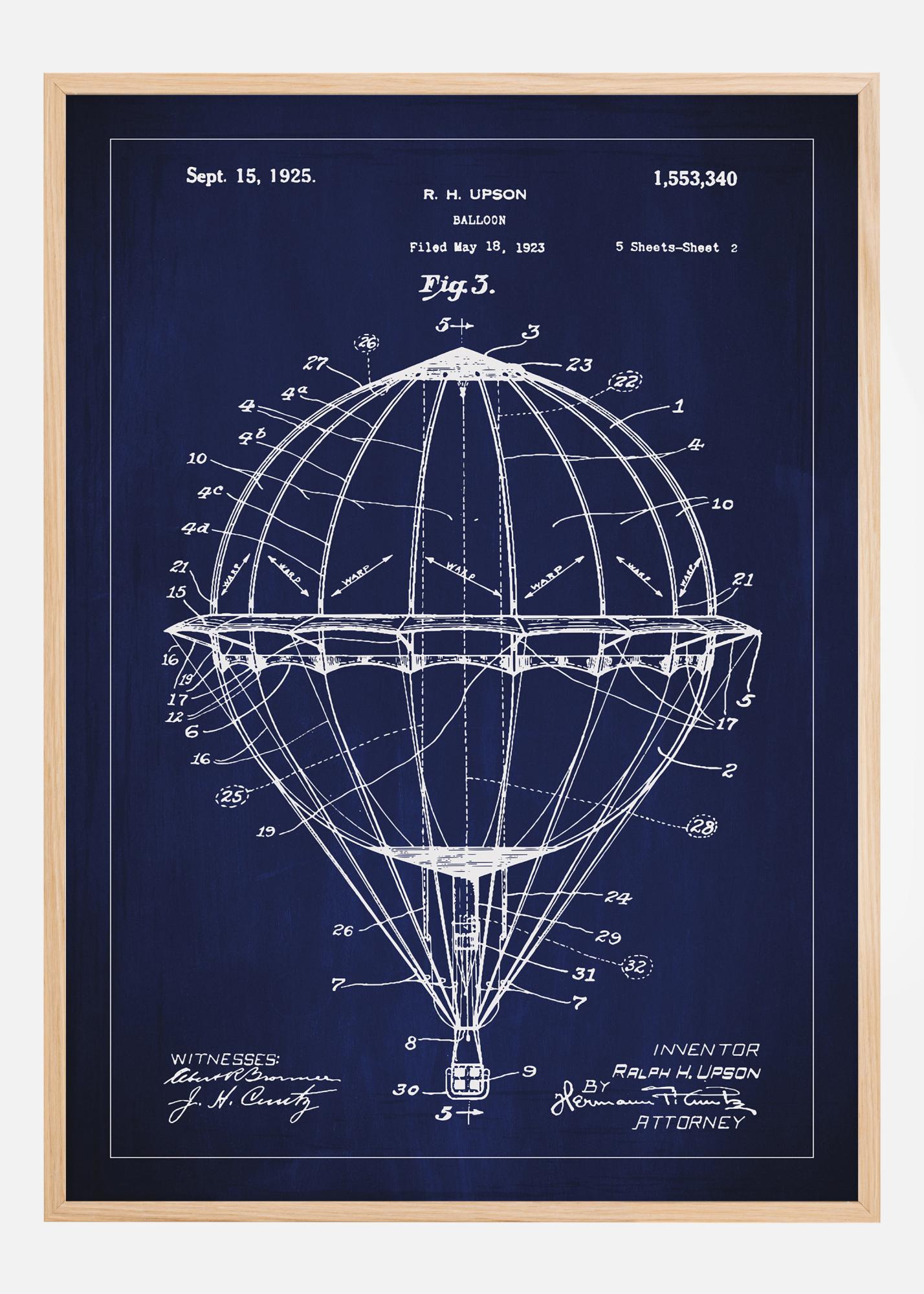 Para el verdadero entusiasta de los primeros avances en tecnología aeronáutica, este cartel de patente ofrece un vistazo a la gloriosa era de los pioneros de la aviación. Presentado el 15 de septiembre de 1925, este dibujo de patente, número 1,553,340, ilustra un globo aerostático diseñado por Ralph H. Upson, que representa un hito importante en el diseño y construcción aerodinámica. Este póster es una representación invaluable de los esfuerzos humanos y los sueños de aventuras celestiales.