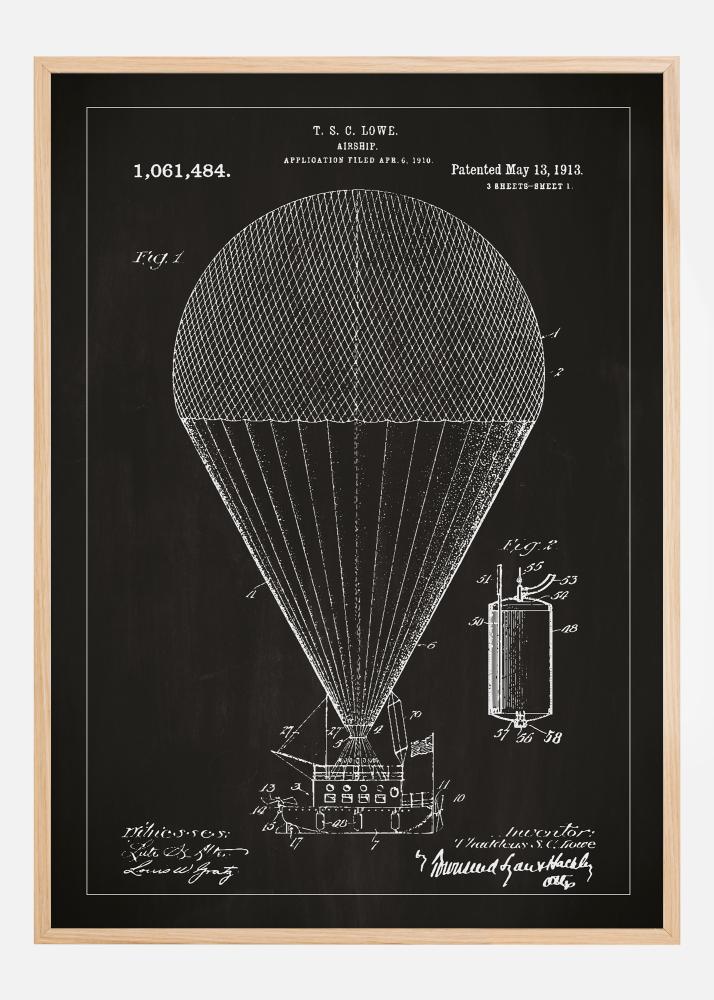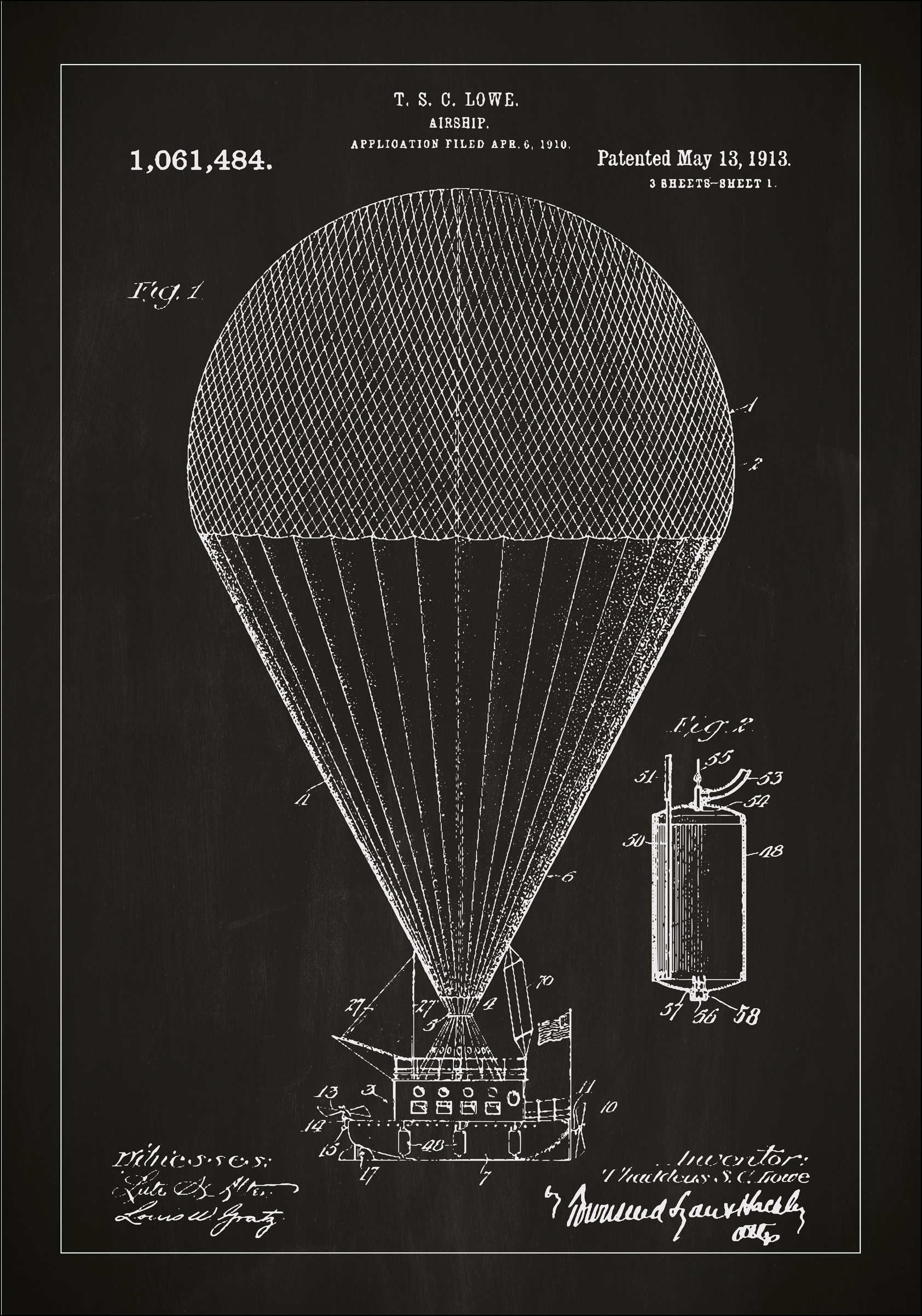 Este póster de patente nos lleva de regreso a los primeros días de la magia y la aventura de la aviación. Con una patente fechada el 13 de mayo de 1913, con número 1,061,484, esta representación meticulosa del diseño de T. S. Lowe para un dirigible constituye un hito tecnológico significativo en la innovación humana. Es una excelente representación artística de los primeros intentos de conquistar el cielo.