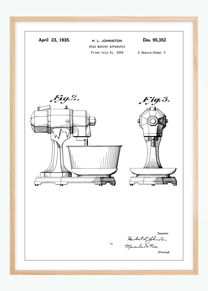 Este cartel de patente meticulosamente detallado representa un aparato para mezclar alimentos, una herramienta necesaria en la cocina que revolucionó el arte culinario. La patente, diseñada por H.L. Johnston el 23 de abril de 1935, bajo el número Des. 95,352, ilustra el diseño temprano de una batidora de pedestal, un utensilio de cocina que se ha vuelto indispensable en la cocina moderna. La figura muestra el aparato en dos vistas, proporcionando una comprensión completa de su construcción y función.