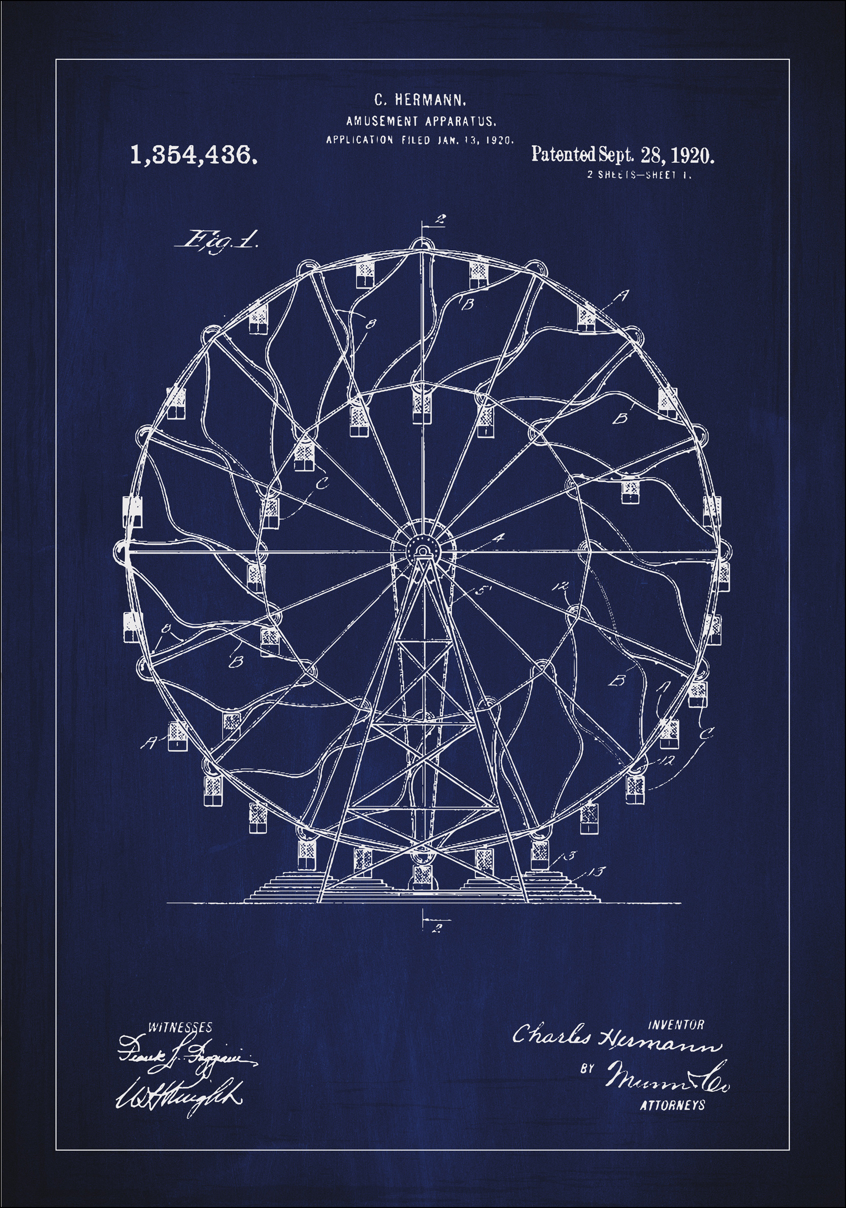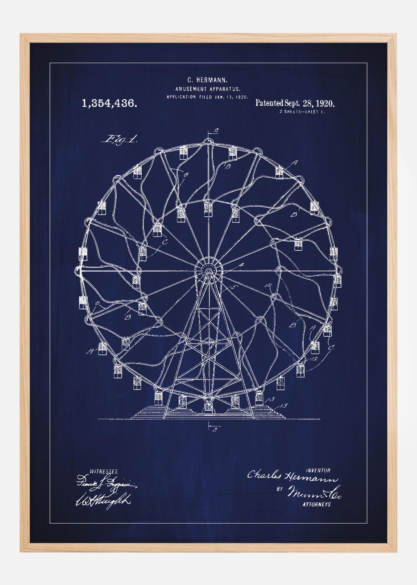 Transforma cualquier pared en un homenaje a la clásica ingeniería con este cartel de patente del diseño de C. Hermanns para una atracción de entretenimiento, especificado en el número de patente 1,354,436 otorgado el 28 de septiembre de 1920. Esta hábilmente creada ilustración de una noria no es solo una obra de arte decorativa, sino también una representación de una época en la que los entretenimientos se convirtieron en logros técnicos. Los detalles en la construcción capturan una era pasada de la edad de oro de los parques de atracciones y la maestría del arte mecánico.