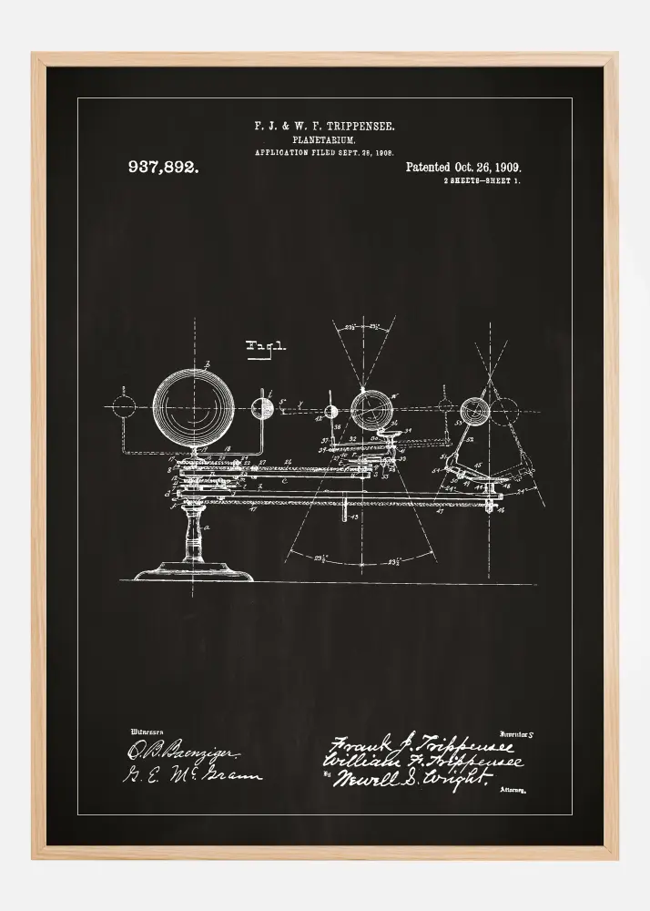 Este póster de patente cuidadosamente diseñado presenta un planetario, un instrumento que allanó el camino para el estudio de los movimientos de los cuerpos celestes. El dibujo de la patente muestra el diseño de F. J. & W. F. Trippensee, al que se le concedió el número de patente 937,892 el 26 de octubre de 1909, tras la solicitud del 28 de septiembre de 1908. Cada detalle y componente de la construcción está bellamente representado, revelando la complejidad y precisión de esta herramienta educativa para la astronomía. Es una imagen fascinante e inspiradora para todos los que tienen una pasión por el cielo estrellado y las herramientas educativas que se han utilizado para explorarlo.