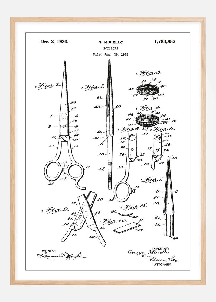 Estiloso e instructivo, este póster de patente representa el diseño innovador de tijeras de G. Mirello, patentado el 2 de diciembre de 1930 bajo el número 1,783,853. Es una visión pedagógica de la evolución de una herramienta de principios del siglo XX, desde las hojas afiladas con precisión hasta las elegantemente diseñadas empuñaduras. Cada detalle en el dibujo de la patente está representado con exactitud, mostrando el conocimiento técnico y la habilidad de diseño que caracterizaban las invenciones de esa época.