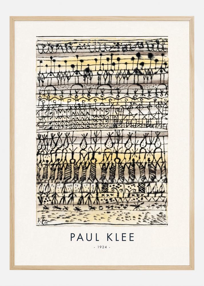 Este cartel representa la obra de Paul Klee "Cooling in a Garden of the Hot Zone" de 1924, un complejo patrón de líneas y formas que recuerda a un jardín en un paisaje abstracto. De manera lúdica, Klee explora temas de naturaleza y estructura apilando capas de elementos simbólicos y geométricos unos sobre otros, creando una composición rítmica y casi musical. El uso variado de tipos de líneas y colores contrastantes da vida al jardín abstracto de una manera que es típica del arte de Klee.