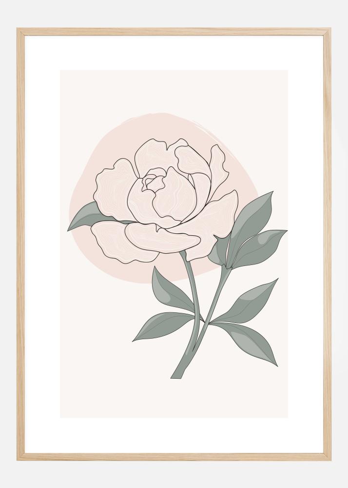 Un póster artístico con un tallo de peonía y una flor rosa. En un fondo color beige, la flor rosa está colocada sobre una figura color durazno, mientras que las hojas están dibujadas en negro. Trae la fragilidad de esta flor a tu hogar.