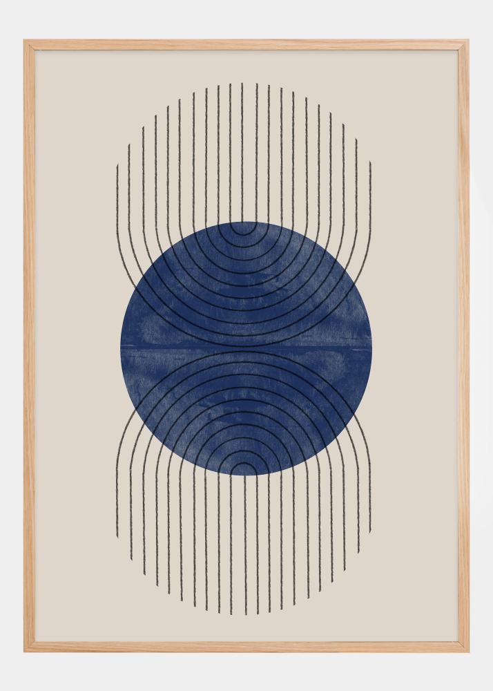 Este póster minimalista y abstracto representa una forma circular de color azul profundo centrada dentro de una serie de líneas verticales que crean una ilusión de movimiento y dimensión. La obra de arte juega con la experiencia óptica de perspectiva y profundidad a través del patrón repetitivo, lo que hace que el círculo azul parezca pulsar o vibrar. La sobria escala de colores consiste en azul profundo sobre un fondo neutral que resalta las líneas limpias del diseño y su simple belleza.