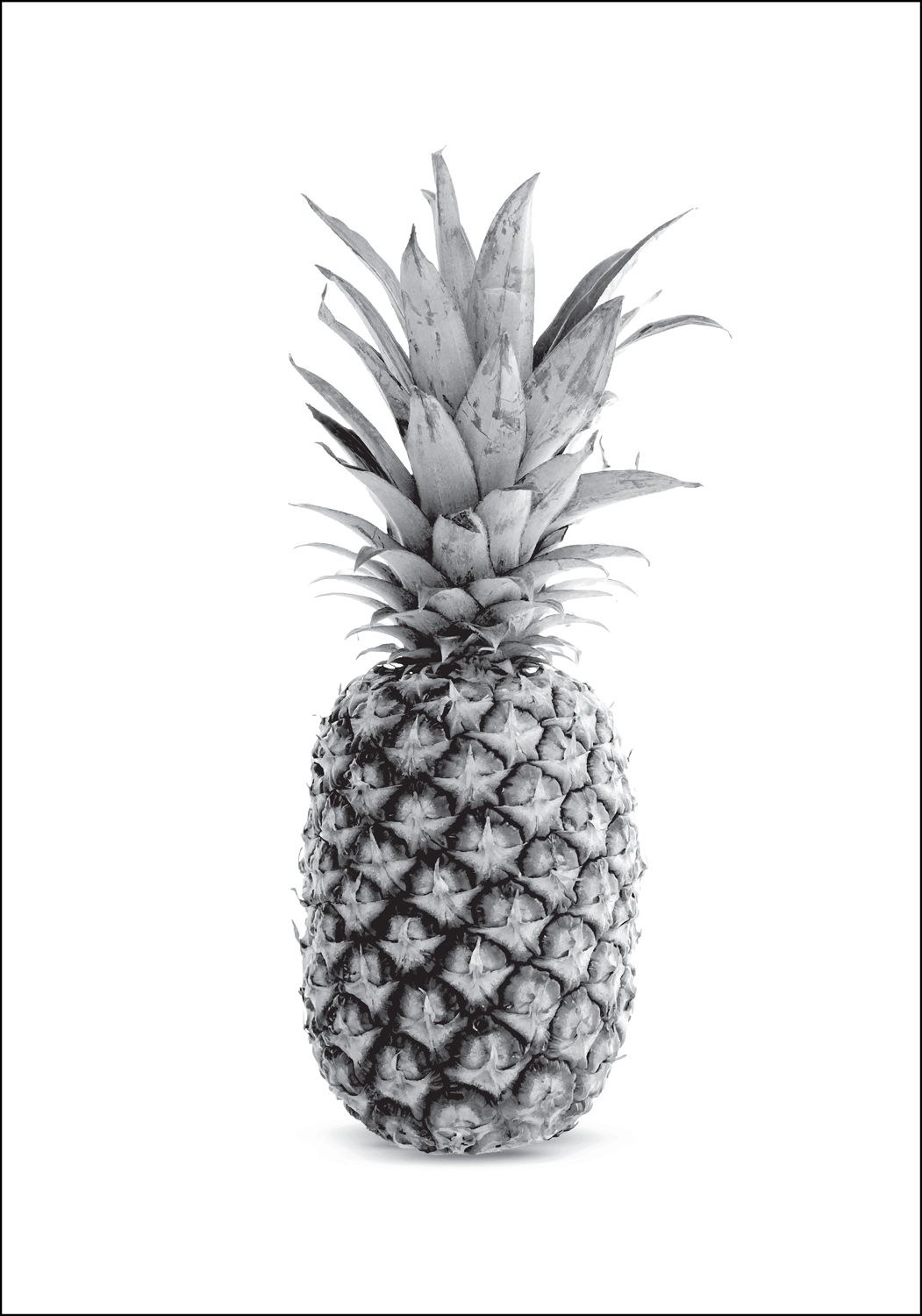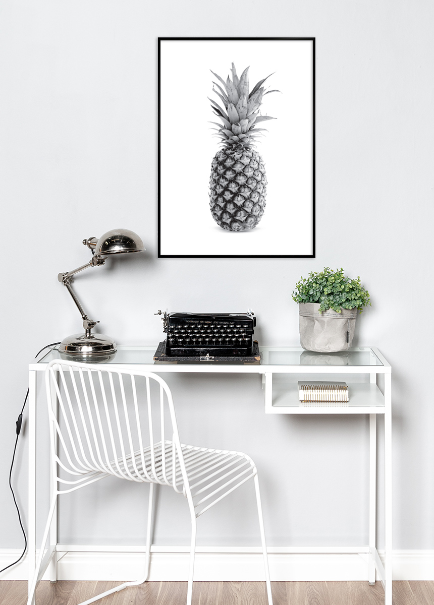 Póster con la fruta favorita de los amantes de la decoración, la piña, perfecto para aquellos que quieren ser conscientes del diseño sin tener que comprar constantemente nuevas frutas. El motivo en blanco y negro hace que el póster se adapte a todos los estilos de decoración y habitaciones del hogar, la impresión también se ve bien en un entorno público. Complementa con un marco de color sólido más fino que no compita con el motivo y que se adapte al entorno donde se colgará el cuadro.