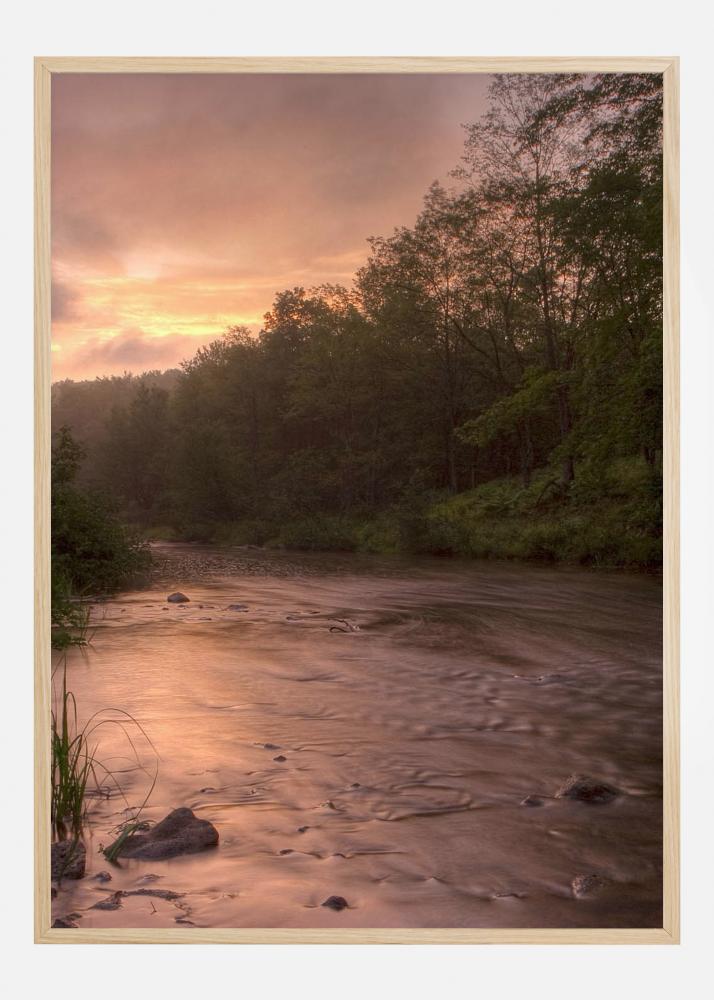 Una fascinante imagen de un río fangoso que fluye a través del bosque. El sol de la tarde de color naranja se hunde entre las nubes y le da un toque discreto de naranja a la imagen. Cuelga este mágico póster en la sala de estar y déjate llevar por la corriente.