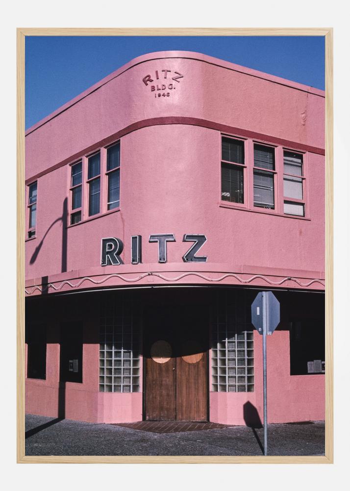 Un póster colorido con el edificio Ritz en rosa de dos pisos. El cielo azul oscuro resalta el edificio rosa oscuro y la puerta de entrada marrón oscuro. La luz del sol refleja la sombra de una farola y un letrero de calle en la fachada del edificio. Una impresión perfecta para todos los amantes de la década de 1940.