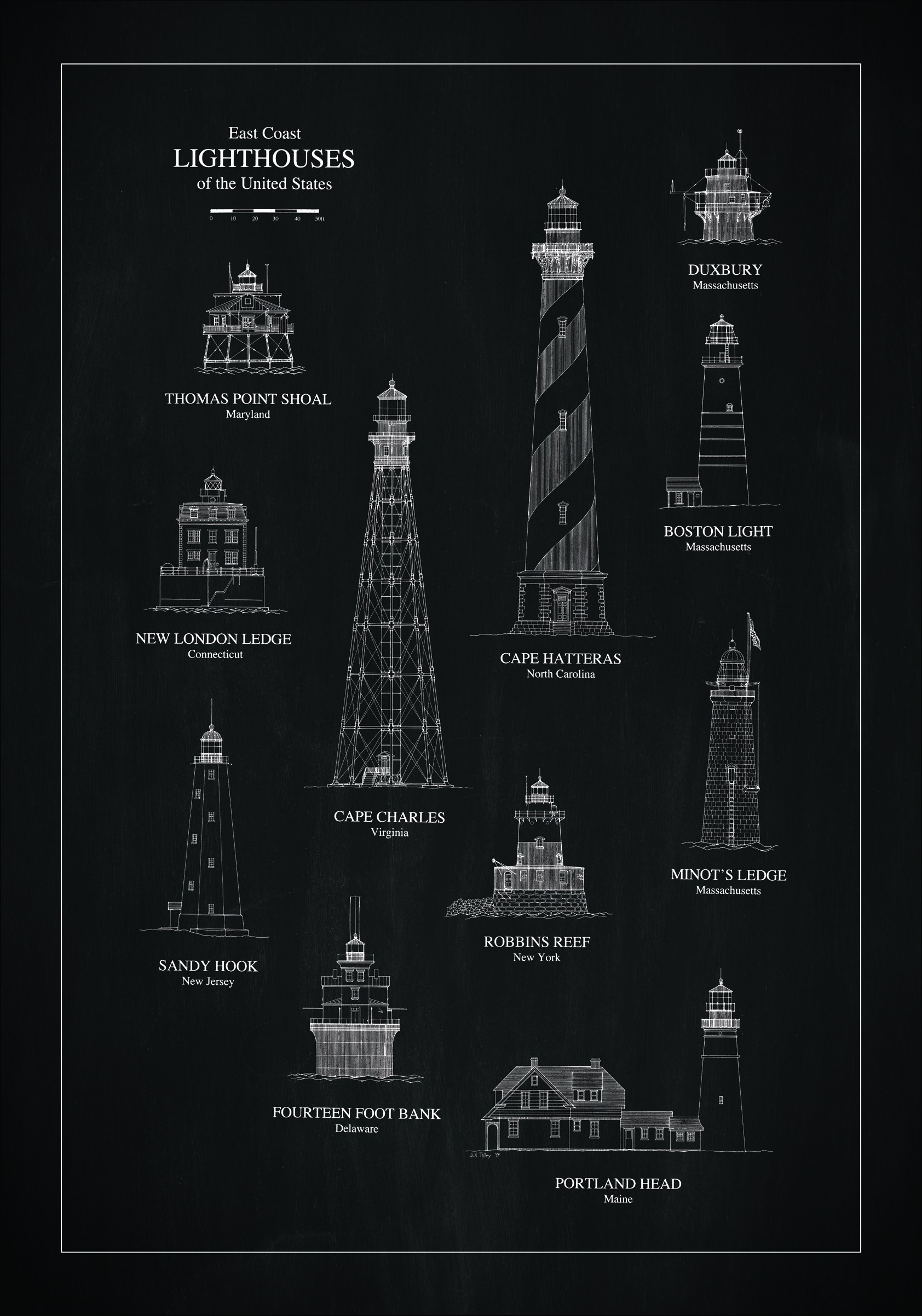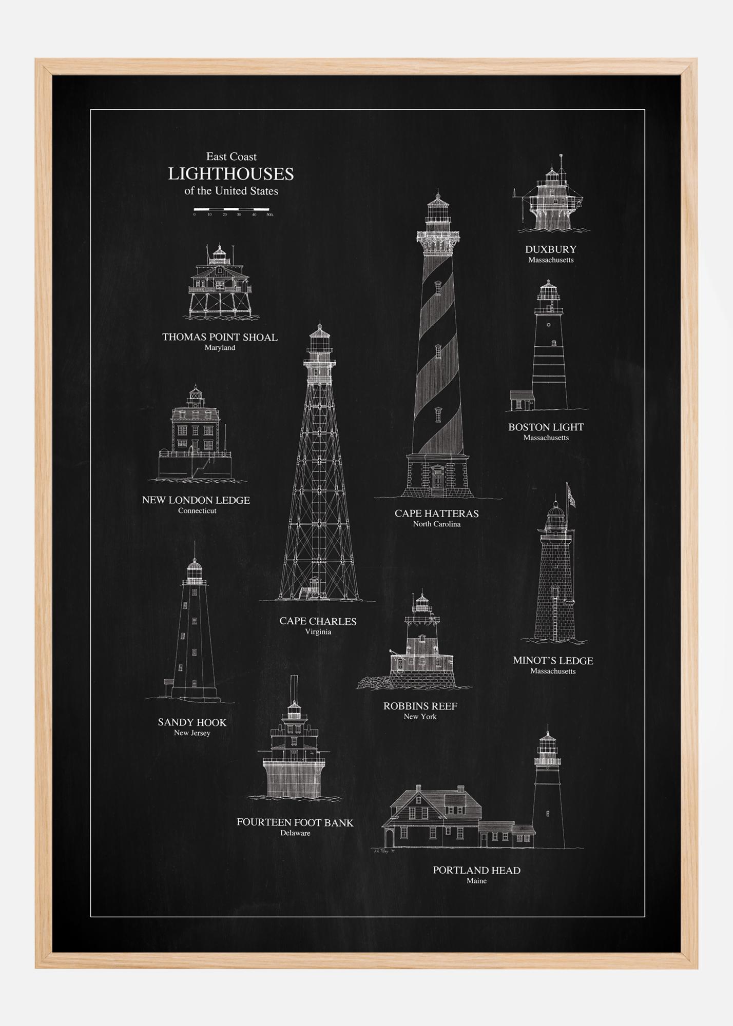 Pizarra - Faros - Costa Este - El póster se imprime en nuestro propio estudio de impresión en papel premium de 230 gramos que está certificado por FSC y es resistente al envejecimiento. Hemos elegido el grosor y la superficie mate para que tenga una sensación de calidad y proporcione una impresión sin reflejos. Como el papel es de una silvicultura sostenible y nosotros mismos imprimimos el producto, reducimos nuestro impacto ambiental.
