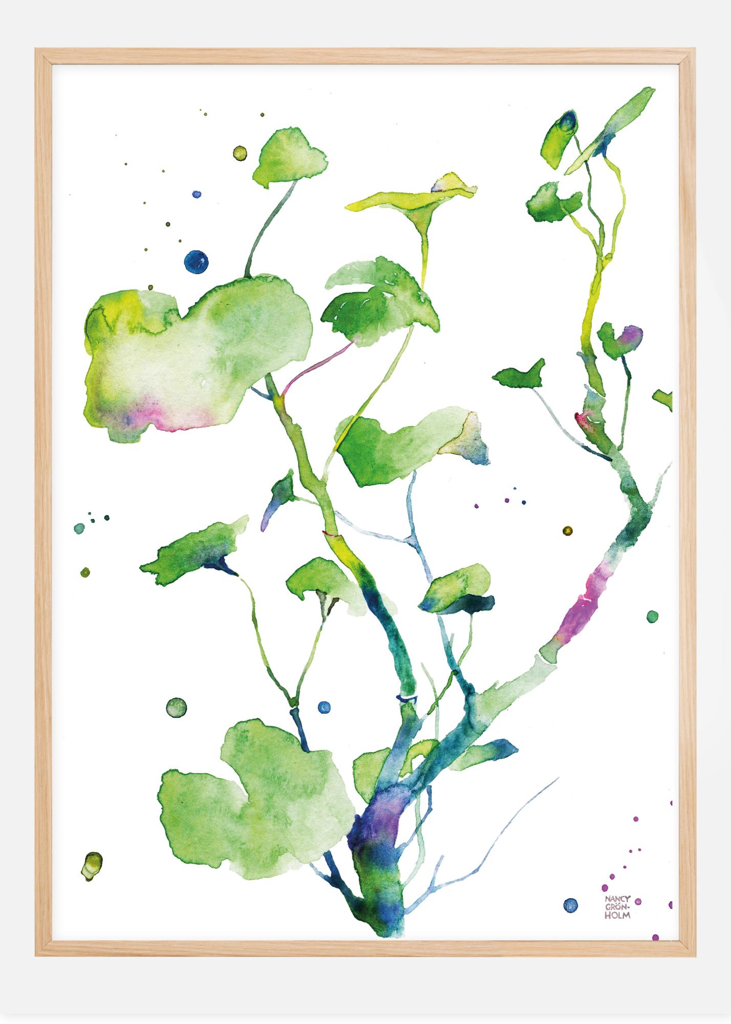 Una divertida impresión botánica de una planta verde. Sobre un fondo blanco, los tonos delicados de lila y rosa iluminan esta impresión. Salpicaduras de color azul se han dispersado alrededor de la imagen para darle un toque divertido. Dale vida a cualquier pared cuando cuelgues este póster en tu hogar.