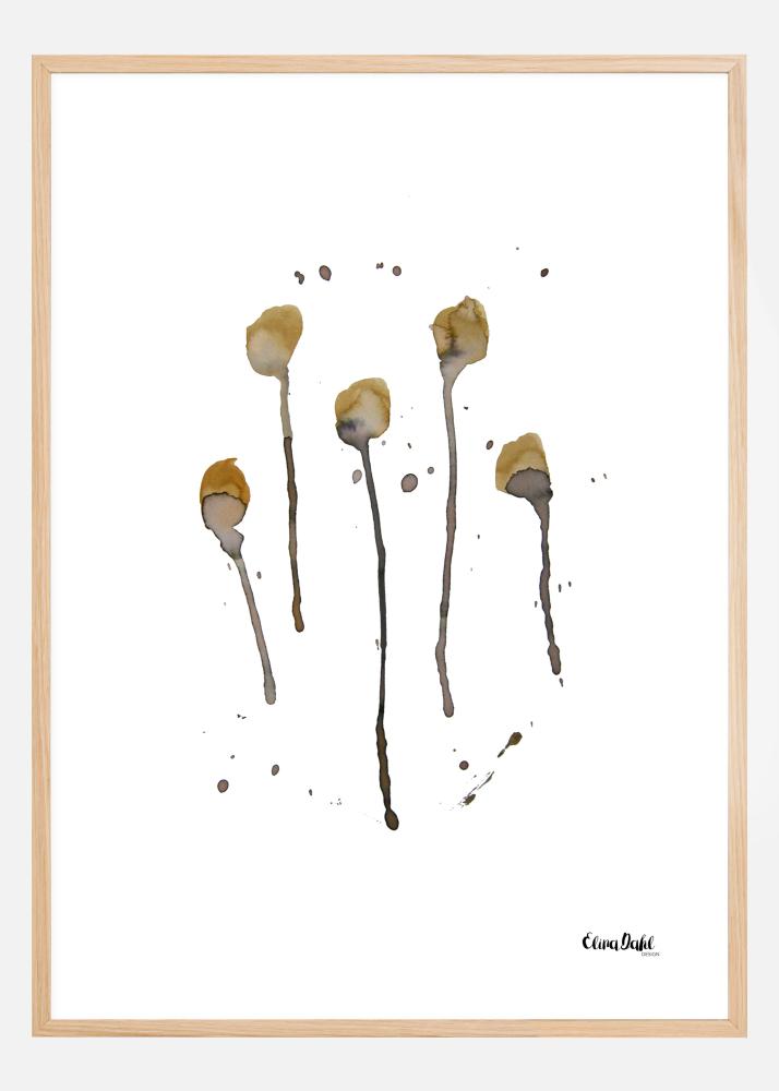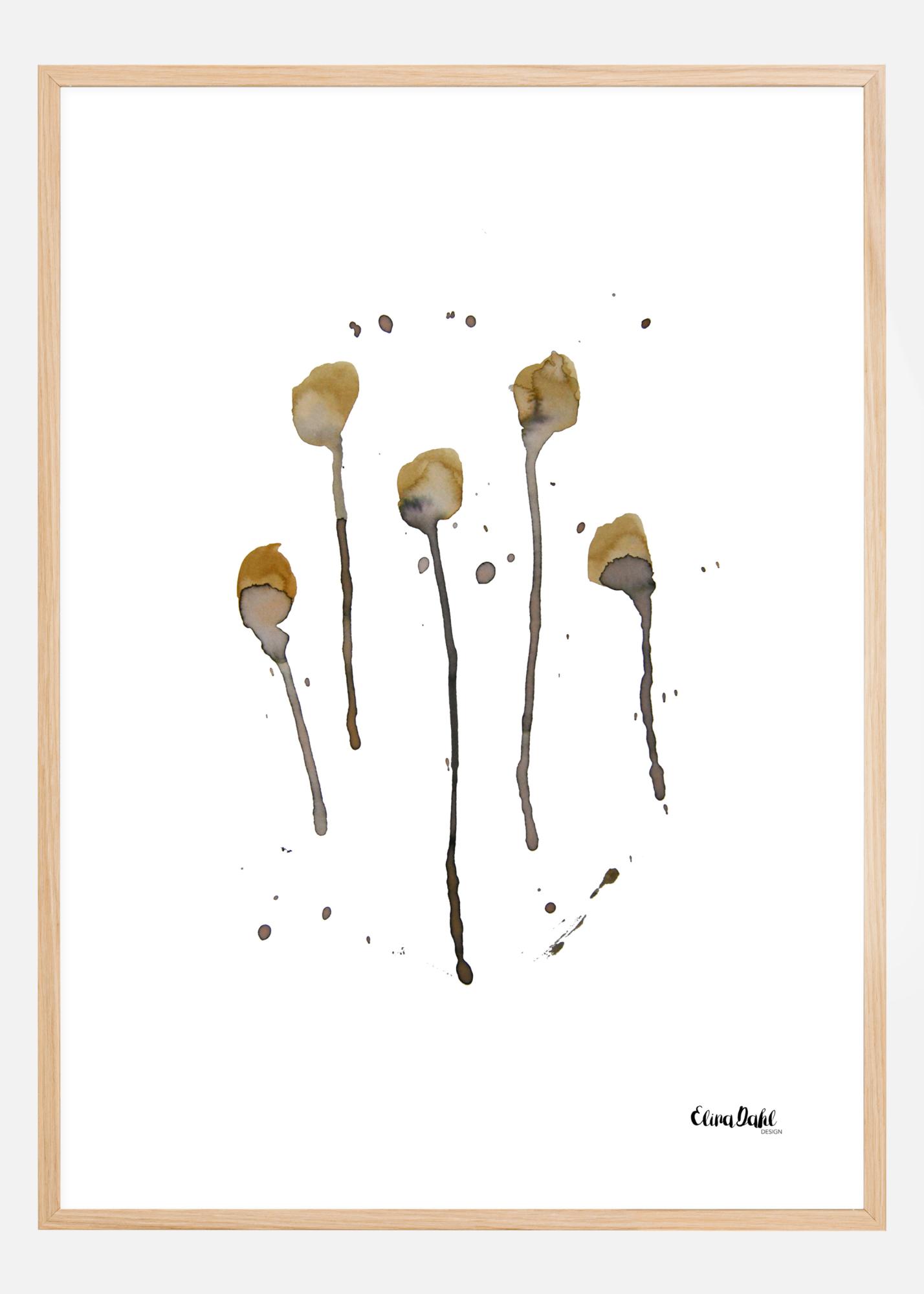 Una impresión botánica con cinco pequeños tallos de flores. Colocados sobre un fondo blanco, los cinco tallos de flores marrones y grises están rectos en el centro del póster. Manchas de color marrón rodean los tallos de forma aleatoria. Un hermoso póster para todos los amantes de las plantas.