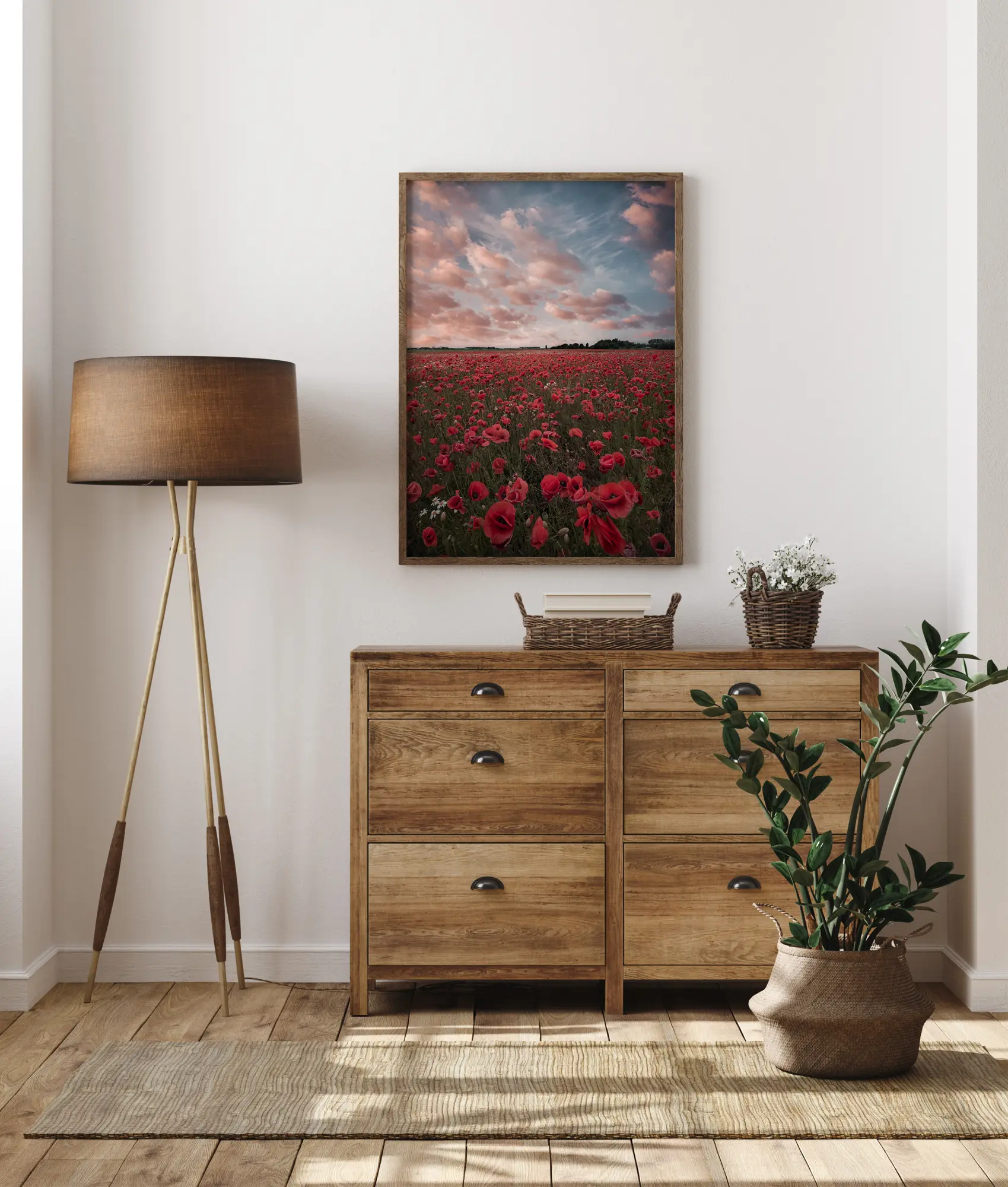 Una fascinante impresión roja de un campo de amapolas. El cielo rojo nublado resalta las hermosas flores rojas de amapola y las margaritas blancas que crecen salvajes en el campo abierto. El suave viento barre el cielo y sopla en las hojas de amapola. Un póster absolutamente fantástico para colgar en tu hogar.